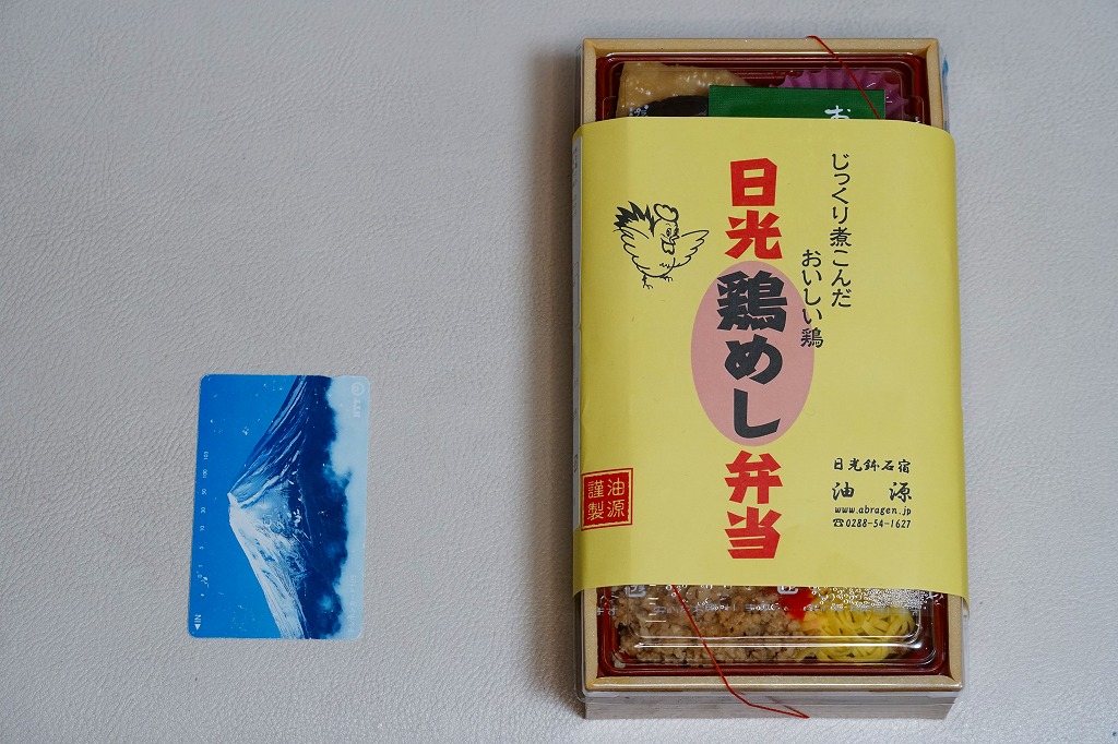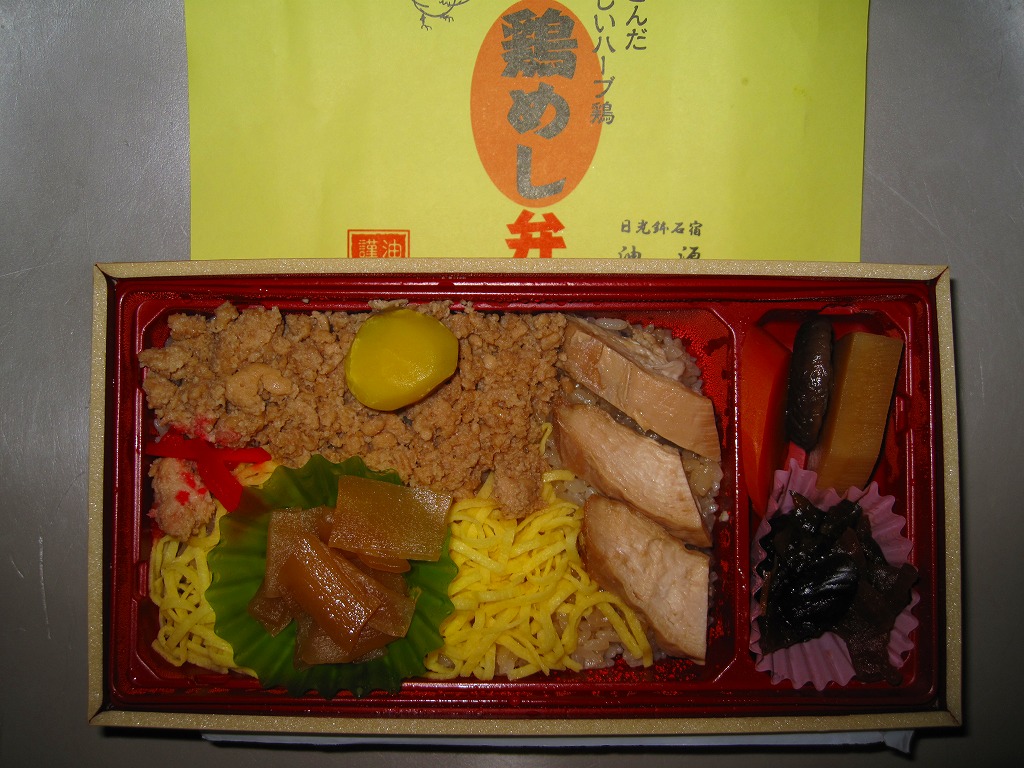 分量豊富でホクホク柔らかい鶏肉の味はくせになるし、全国各地に広がる鶏飯駅弁にこのような内容と風味は思い当たらない。ネット上のブログにはおいしかった報告がいくつも見付かる、日光の地になければ主役を張れそうな、B級グルメの面構えをした高品質な創作弁当。見本写真によれば、本来は具が鶏ほぐし身を埋め隠すレイアウトである模様。価格は2009年の購入時で850円、2014年4月の消費税率改定で880円、2020年時点で950円、2021年時点で920円、2022年時点で960円、2023年時点で1,000円、2024年時点で1,080円、2025年時点で1,150円。