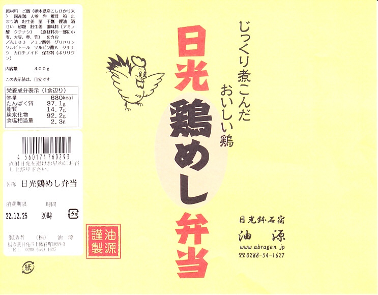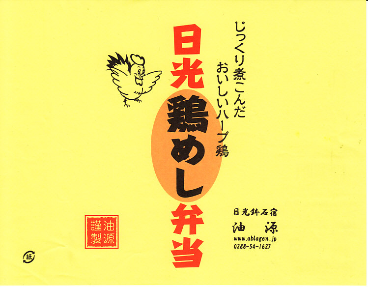 長方形の容器に透明なふたをして、商品名を書いたシンプルな黄色い掛紙を巻く。中身は茶飯の上を錦糸卵と鶏肉そぼろと鶏香味焼で覆い、かんぴょうと栗を載せ、煮物とたまり漬を添える。かんぴょうで栃木を、たまり漬で日光を演じていると思うが、まあ普通の鶏飯駅弁。飾らない普段着姿が、また良い。価格は2010年時点で800円、2014年4月の消費税率改定で830円、2020年時点でおそらく850円、2022年時点で950円。