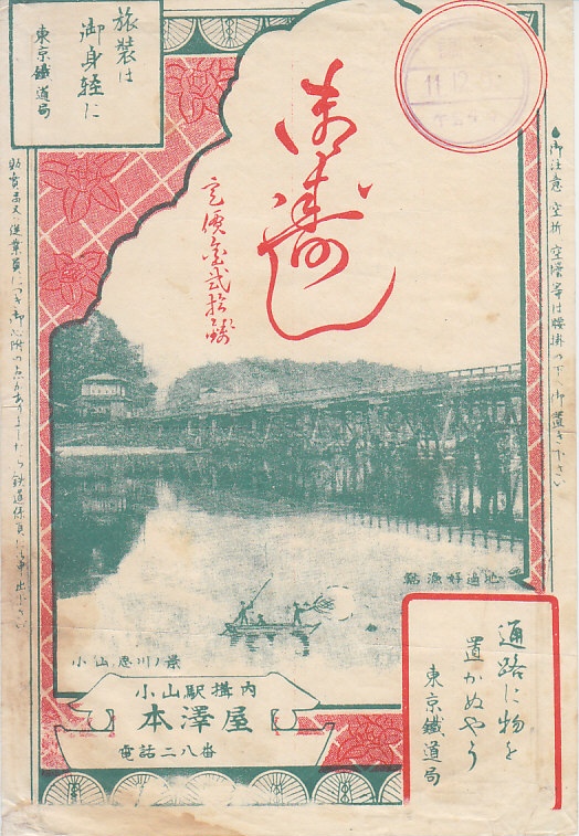 1929(昭和4)年11月16日の調製と思われる、昔の小山駅弁の掛紙。当時で60銭の駅弁というのは、幕の内駅弁の倍額、今でいう2000円くらいの感覚で、類例に乏しい高額だと思う。掛紙のサイズも、気持ち大きめ。小山思川之景、鮎漁好適地という、思川と木橋の写真を使う。