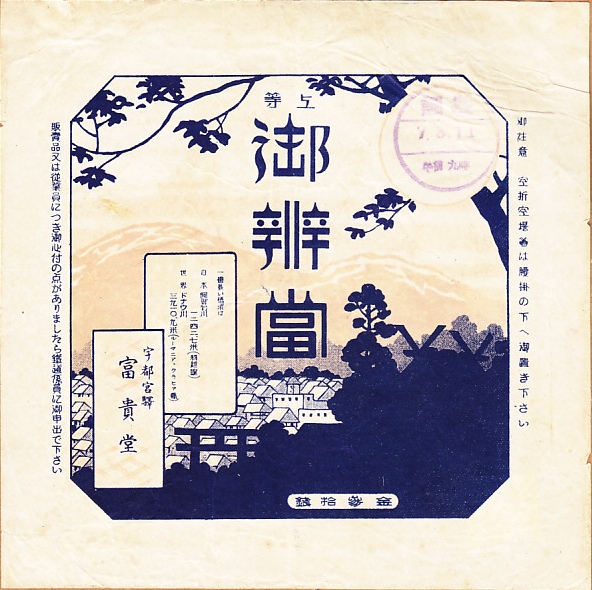 1932(昭和7)年3月11日9時の調製と思われる、昔の宇都宮駅弁の掛紙。おかずの掛紙は、下記の1930(昭和5)年の「上等御辨當」と同じ。御飯の掛紙は鉄道省の東京鉄道局管内の各社で共通のものと思われる、桜の便りとして管内各地の桜の名所と簡略の路線図を描く。
