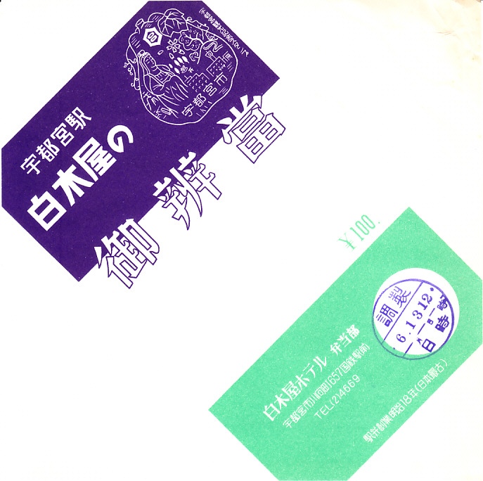 1963(昭和38)年6月13日12時の調製と思われる、昔の宇都宮駅弁の掛紙。これではまるで駅弁掛紙には見えなくても、宇都宮駅の駅弁屋であるしろきや(白木屋)と東北線弁当販売の連名ならば、宇都宮駅か東北本線の車内販売向けの掛紙だろう。