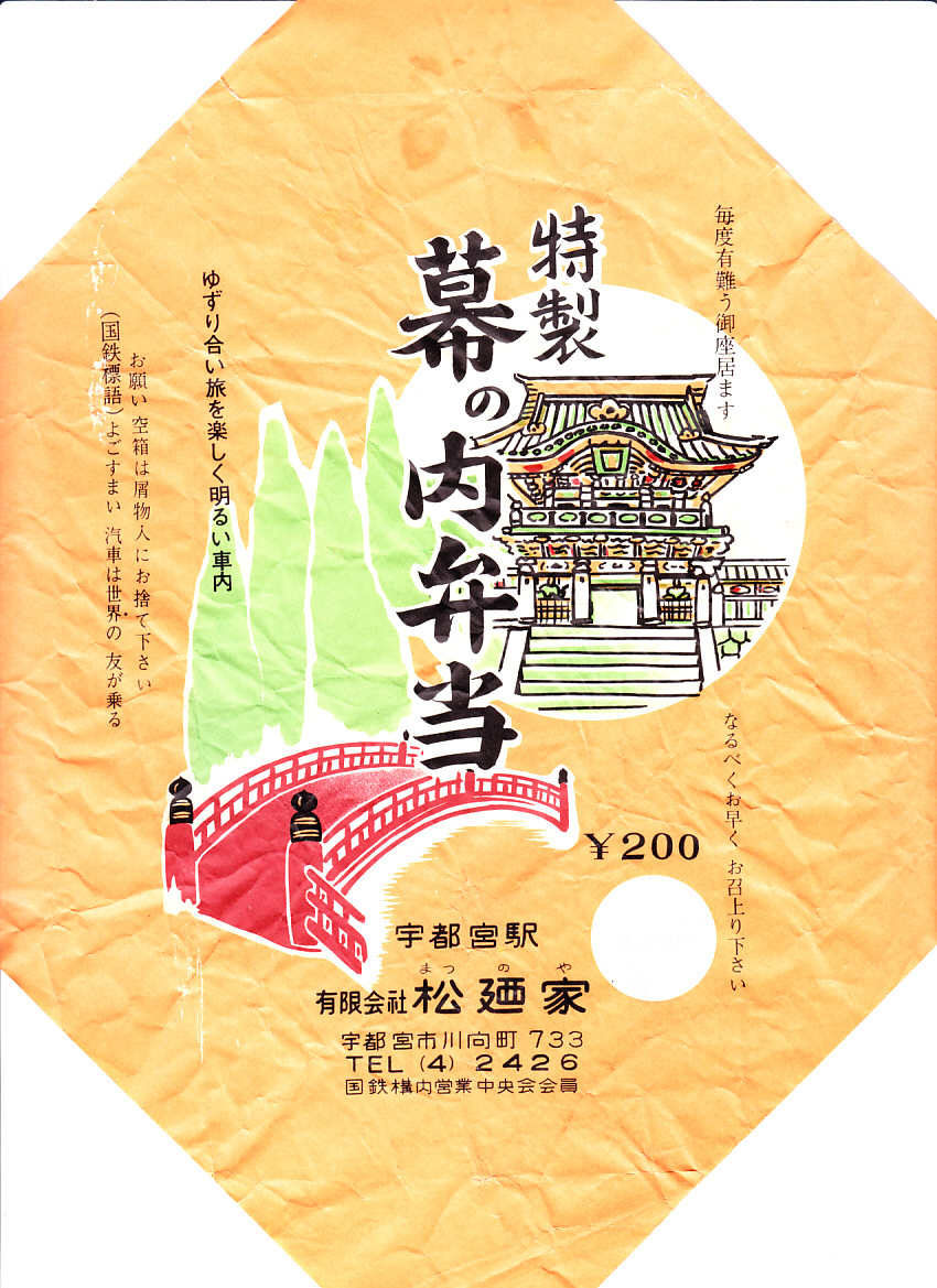 1970年代の調製と思われる、昔の宇都宮駅弁の掛紙。日光の東照宮陽明門と神橋に杉並木を描いたものか。