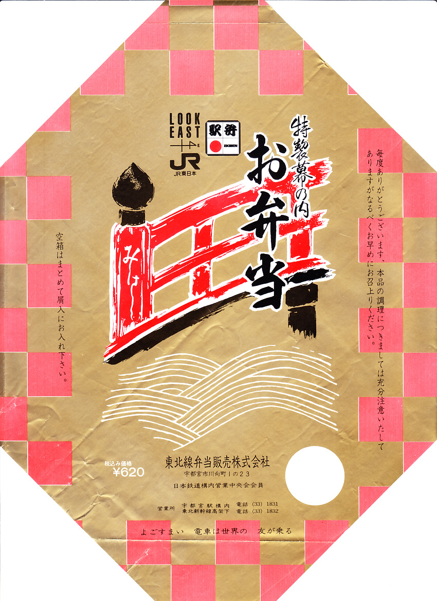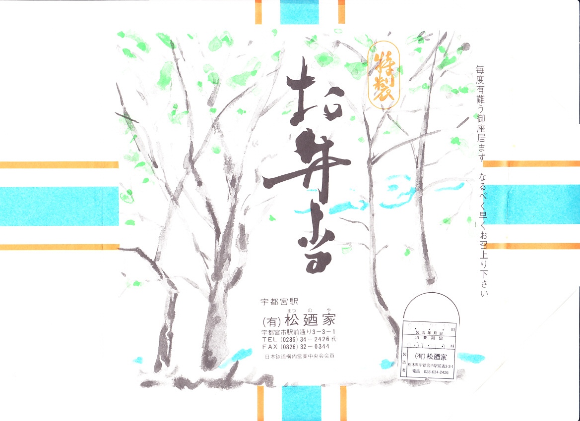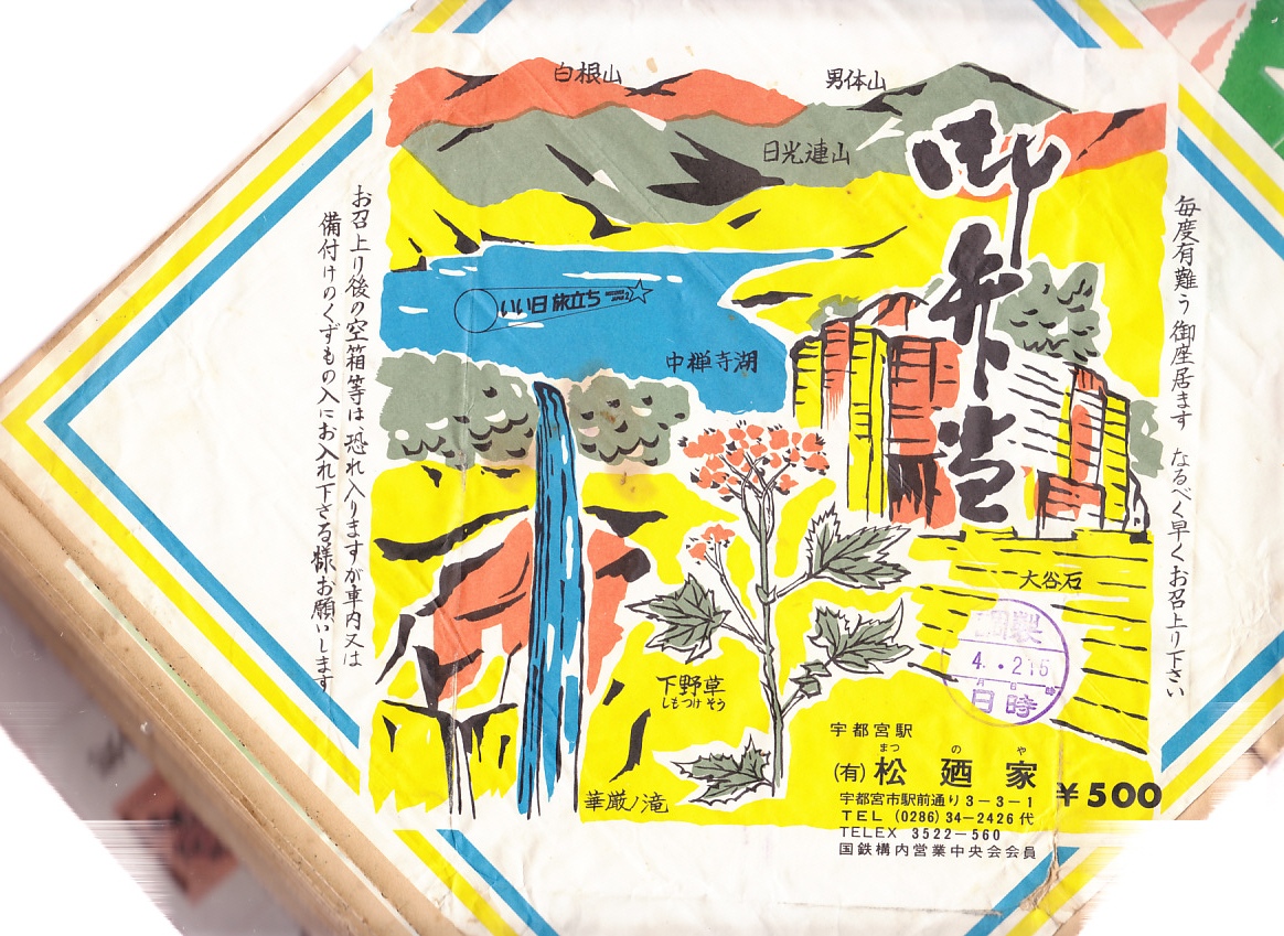昭和50年代、1980年前後の、4月2日16時の調製と思われる、昔の宇都宮駅弁の掛紙。白根山に男体山の日光連山と中禅寺湖に華厳ノ滝、下野草に大谷石と、宇都宮を玄関口とする観光資源の一部を賑やかに描く。この当時で活字でなく手書きの文字を多用する掛紙は珍しいかもしれない。