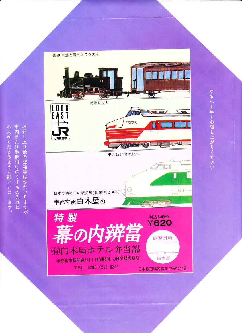 入手状況から1989年頃のものと思われる、昔の宇都宮駅弁の掛紙。「国鉄10型機関車クラウス型」の汽車と「特急ひばり」の電車と「東北新幹線やまびこ」の新幹線のイラストを並べて、時代の移り変わりを表したものか。