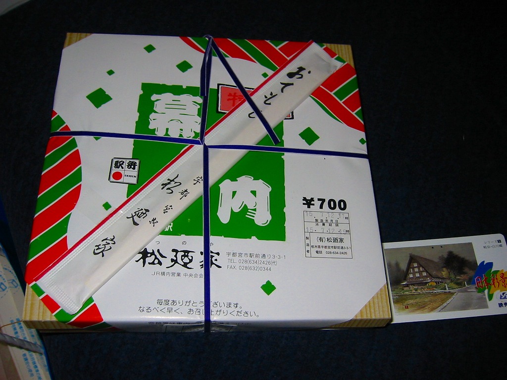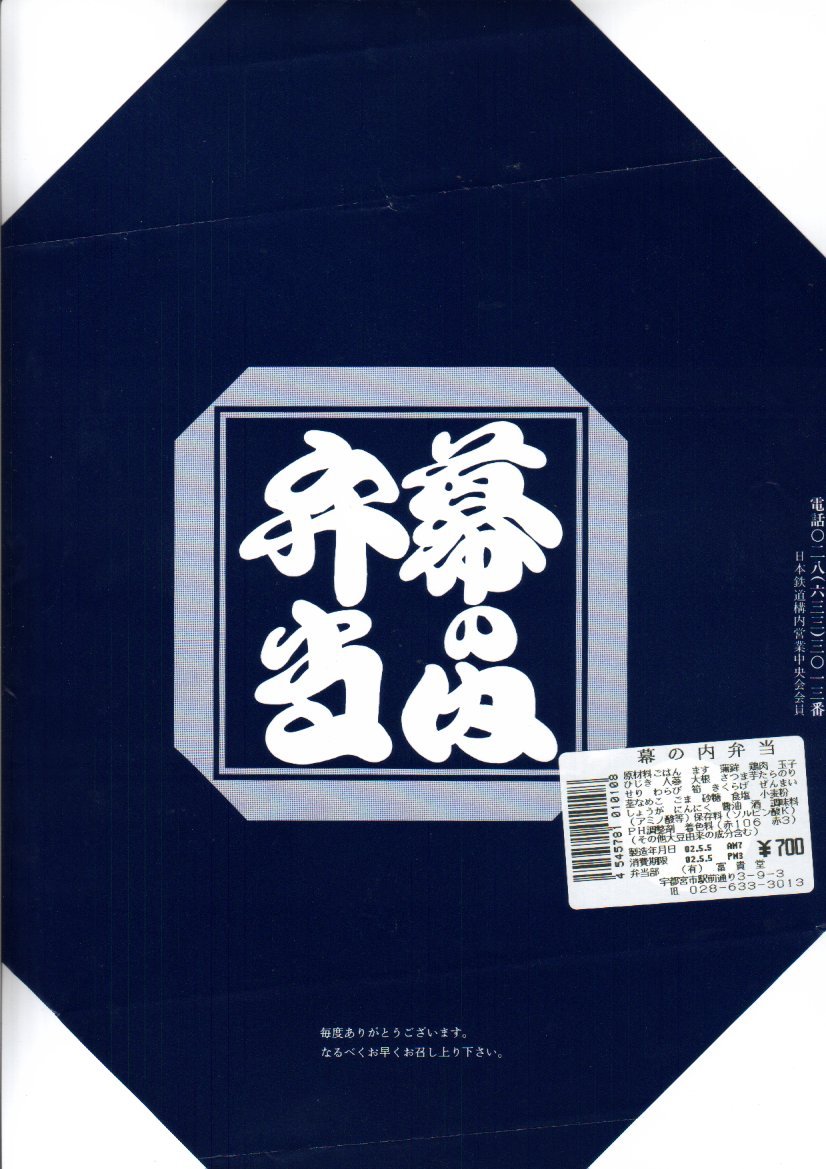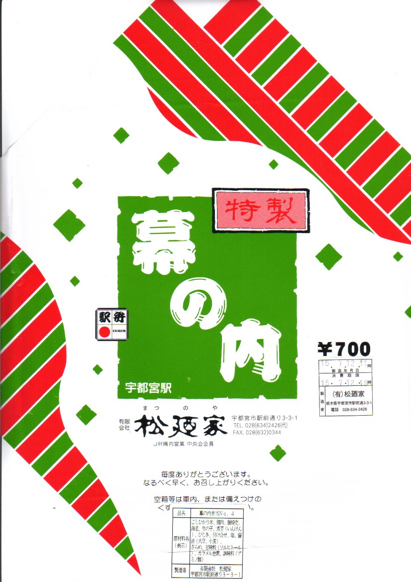 2003(平成15)年7月12日に購入した、宇都宮駅弁の掛紙。内容と価格は上記の2006年のものと同じ。この当時は駅弁らしく、専用の掛紙を使い、容器もあからさまな汎用の市販品ではなかった。中身は変わらない。2006年や2022年のものと、値段まで変わらない。