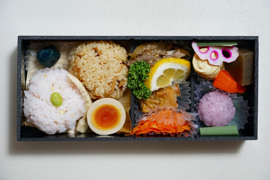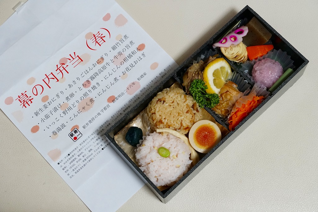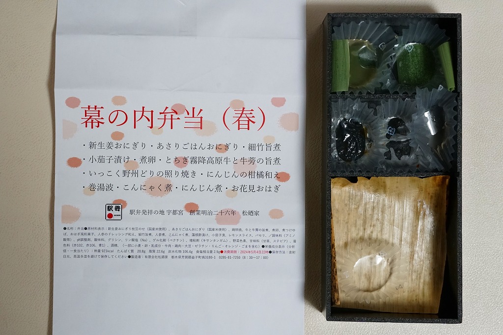 宇都宮駅弁の幕の内弁当の、2024年時点での姿なのかどうか。商品名とおしながきと食品表示を記した文字だらけの掛け紙に包まれた真っ黒なプラ容器の、左側に新生姜おにぎり、あさりごはんおにぎり、細竹旨煮、小茄子漬け、煮卵を、右側にとちぎ霧降高原牛と牛蒡の旨煮、いっこく野州どりの照り焼き、にんじんの柑橘和え、巻湯波、こんにゃく煮、にんじん煮、お花見おはぎを詰める。これは幕の内弁当なのだろうか。「大人の休日倶楽部駅弁発祥の地より汽車辨當」と同じような創作にみえる。値段は宇都宮駅弁にしては高額になった。