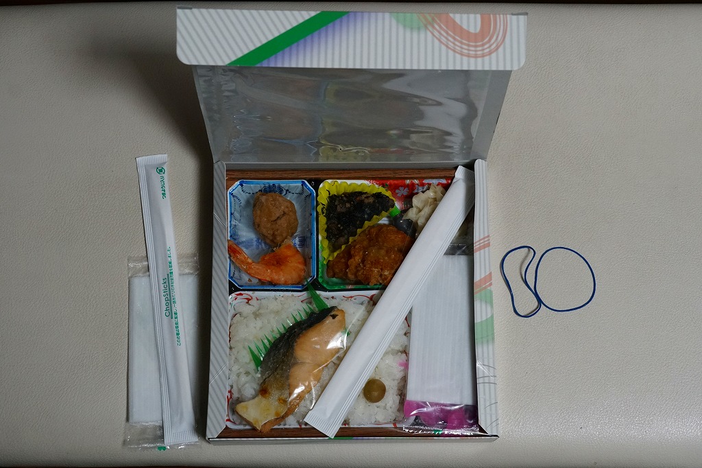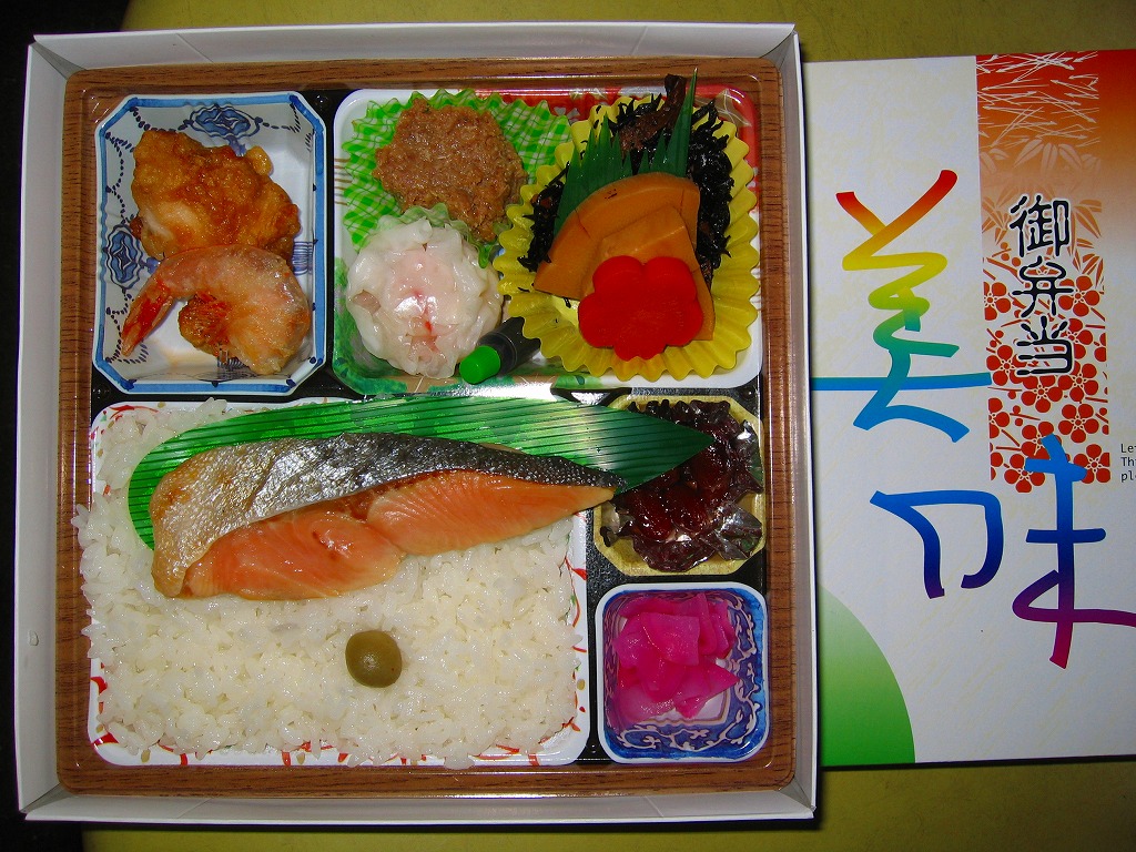 旅館の食事で見るような器の絵柄を印刷した、これも市販品のトレーの中に収まる中身は、マスの塩焼きを載せた日の丸御飯、海老からあげ、つくね寄せ、鶏唐揚、海鮮しゅうまい、ひじき煮、タケノコ煮、煮豆、大根桜漬。見た目に加えて内容や風味も野暮ったい、あるいは小さな弁当店が手作りしたような、古めかしい幕の内駅弁あるいは惣菜弁当。