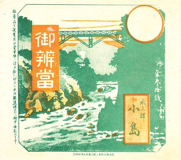 おそらく1930年代のものと思われる、昔の水上駅弁の掛紙。どこかは分からないけれど、この地にありそうな鉄橋と渓流を描いた。参考にした写真に写らなかったのか、橋梁の部材が少し足りないと思う。