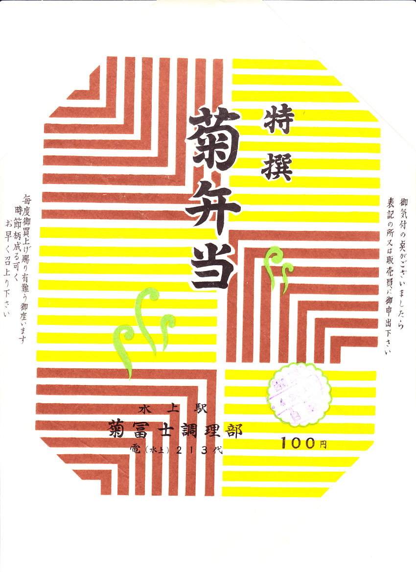 1963(昭和38)年4月23日の調製と思われる、昔の水上駅弁の掛紙。駅弁の名前は、菊花か何かを入れたのではなく、菊冨士という調製元の弁当という意味か。そんな調製元の名前以外に、具体的な駅や地域を示す絵柄や記述はない。
