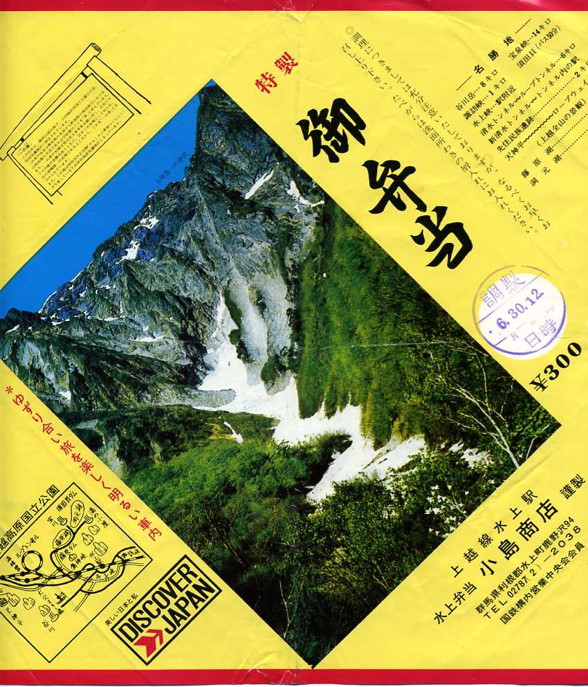 入手状況等から1972(昭和47)年6月30日12時の調製と思われる、昔の水上駅弁の掛紙。谷川岳を代表する風景のひとつである一の倉沢の写真で、その玄関口をアピールする。この駅で駅弁が買えなくなる時代が来るとは、きっと当時では想像できなかったに違いない。