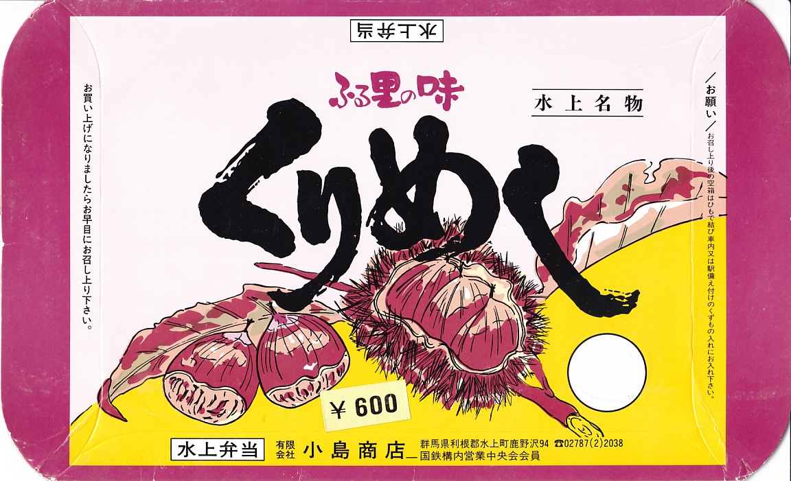 1980年代のものと思われる、昔の水上駅弁のパッケージ。調製元は小島商店。この「くりめし」と、上記の「とりめし」は、水上駅で最後まで残った駅弁であった。ここにも水上小唄の歌詞が載る。