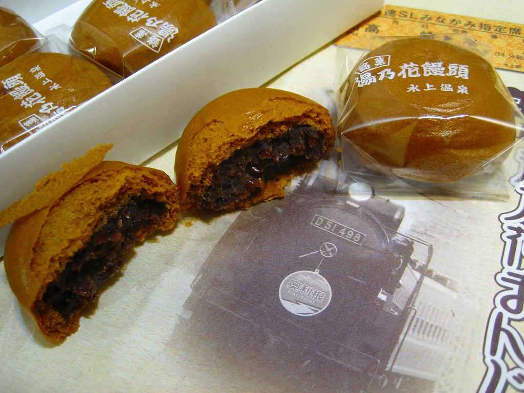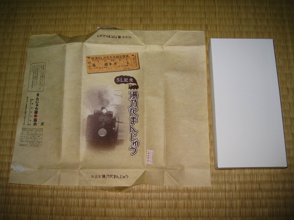 これは駅弁ではなく、鉄道にちなんだ土産物。北海道産の小豆、沖縄産の黒糖と群馬県産の赤糖を使ったという饅頭が8個で680円。包装紙は上越線を運行するSL列車にちなんでおり、写真は実際に使われる蒸気機関車、きっぷのイメージに記される列車名と区間と時刻は実際のもの、さらに購入日の日付が定位置に押されていた。地元で観光列車が大切にされていることが、これで分かるもの。駅弁がないことがつくづく惜しい。