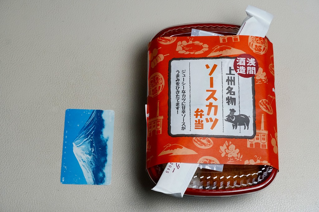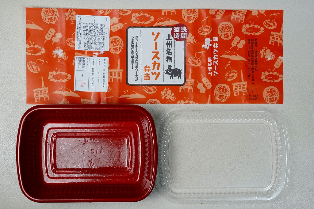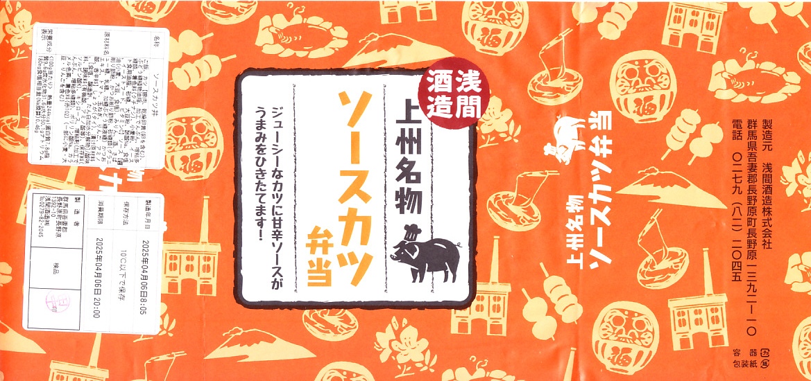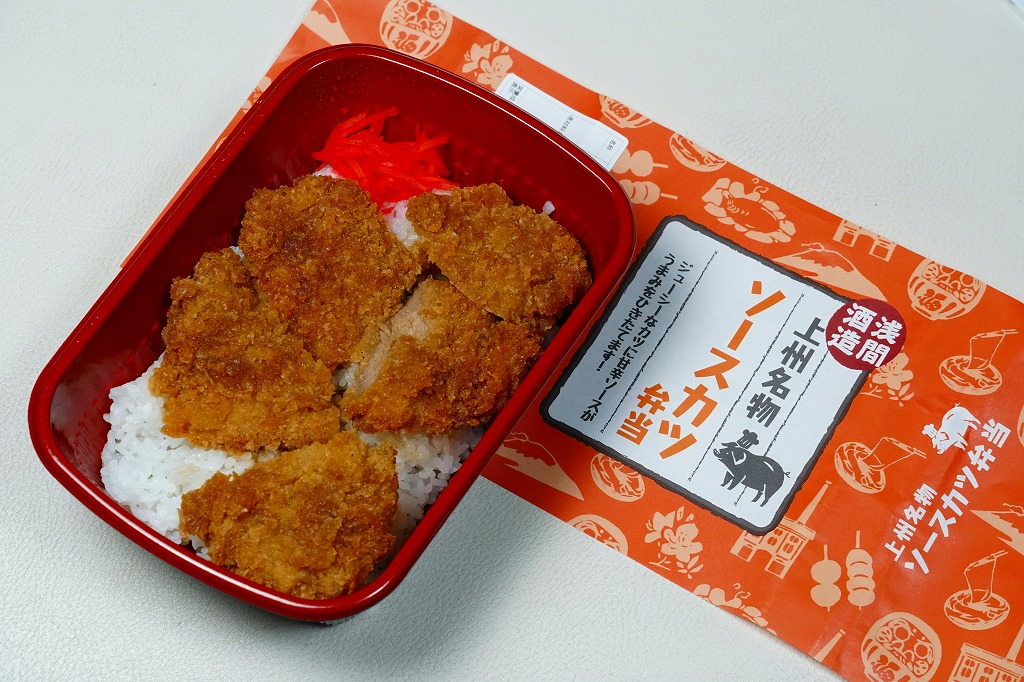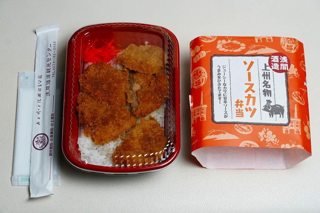 2022(令和4)年までに、長野原草津口駅の隣の店舗などで発売か。群馬の名所名産をいろいろアイコンにしたとみえる、オレンジ色の掛紙を巻くホカ弁向けプラ容器に白飯を詰め、ソースカツで覆い、紅生姜を添える。調味料と付合せ以外はほぼ飯と肉だけの、シンプルな内容。薄味で手作り感のあるトンカツにより、この中身でも軽い味がしたと感じた。今回2025年の訪問時で、長野原草津口駅の隣の公共施設「長野原・草津・六合ステーション」では、これと「上州牛すき焼き弁当」(1,800円)と「カツサンド」(900円)が売られていた。