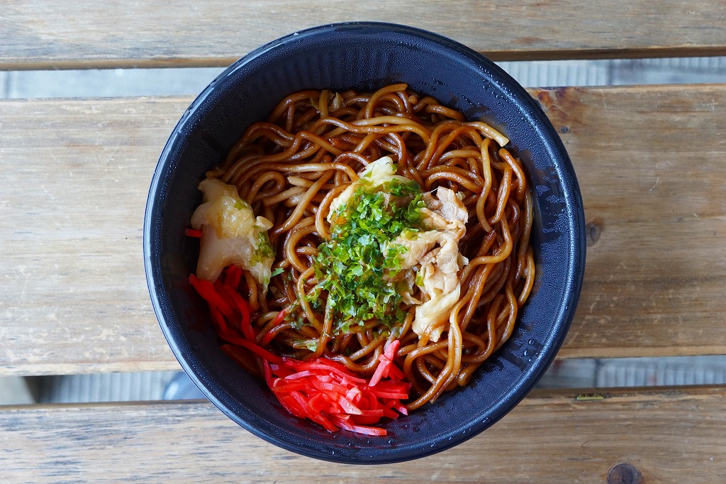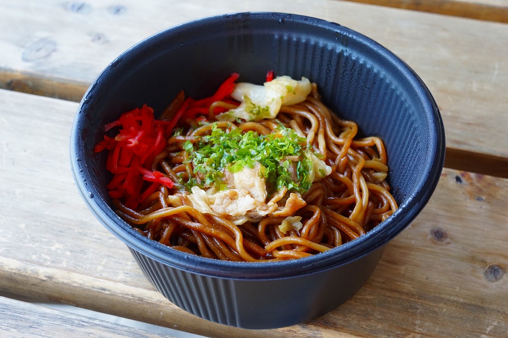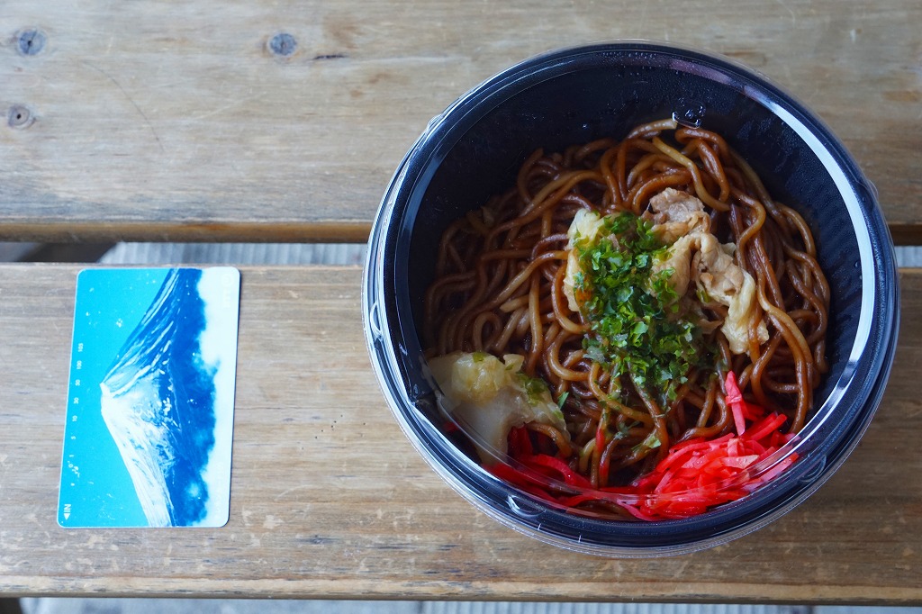 上記の「上州牛すき焼き弁当」「鳥めし弁当」と同様に売られていた弁当。プラ容器に焼きそばを詰めただけ。駅弁のような要素を期待して一緒に買ってみたが、ただの惣菜だった。味はもちもちして、おいしかった。