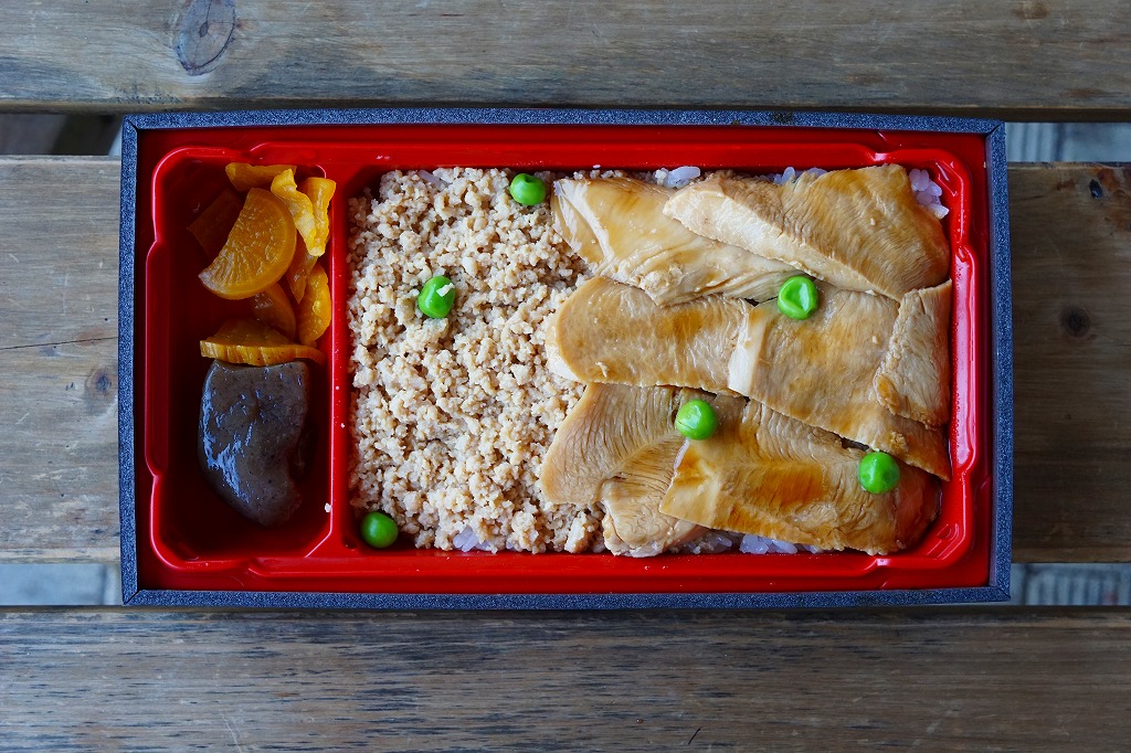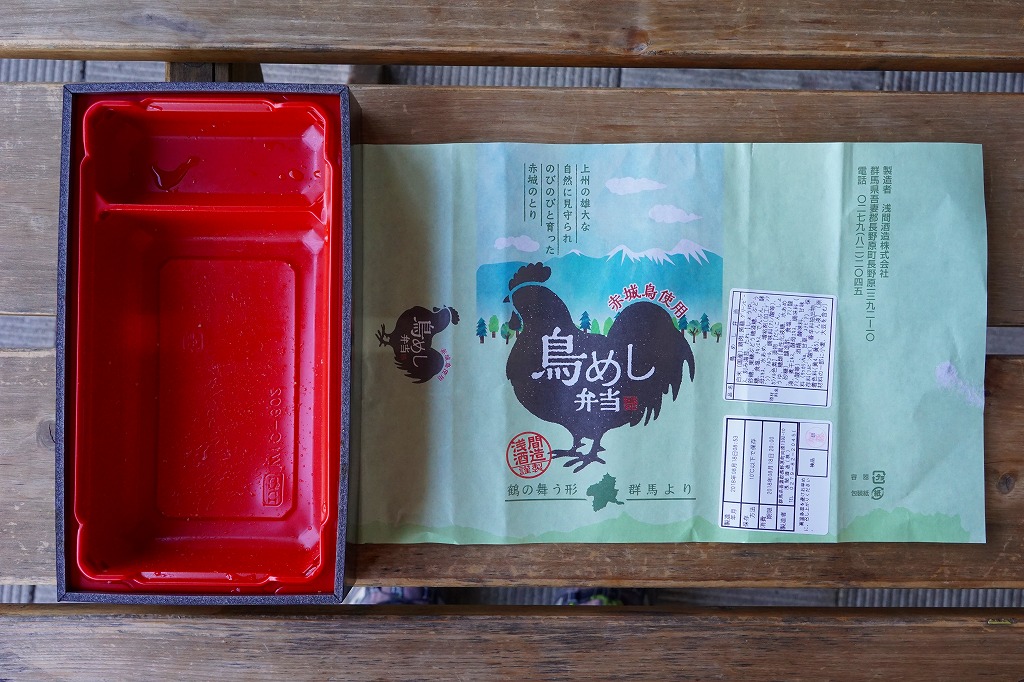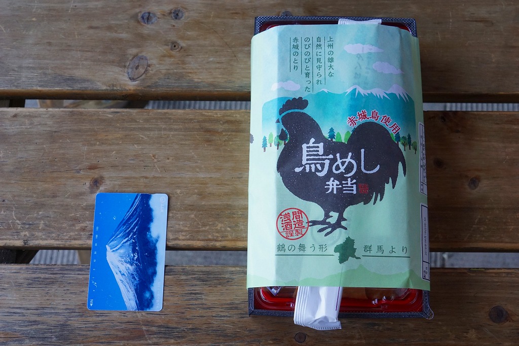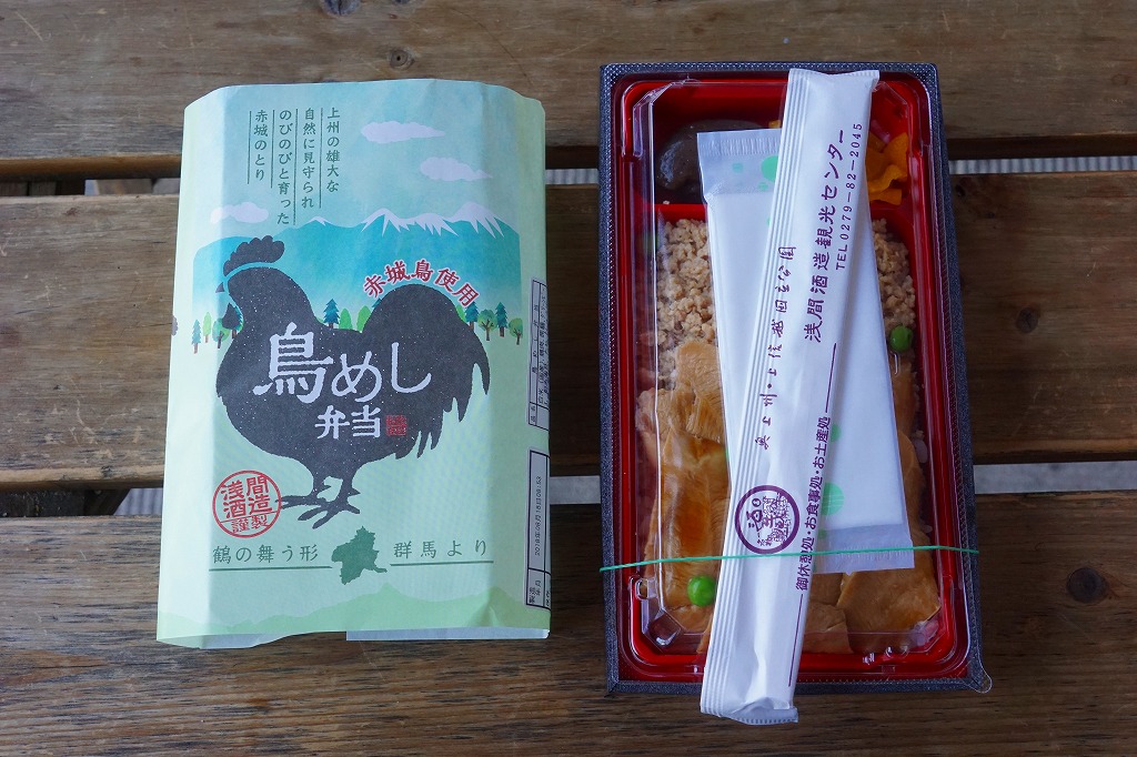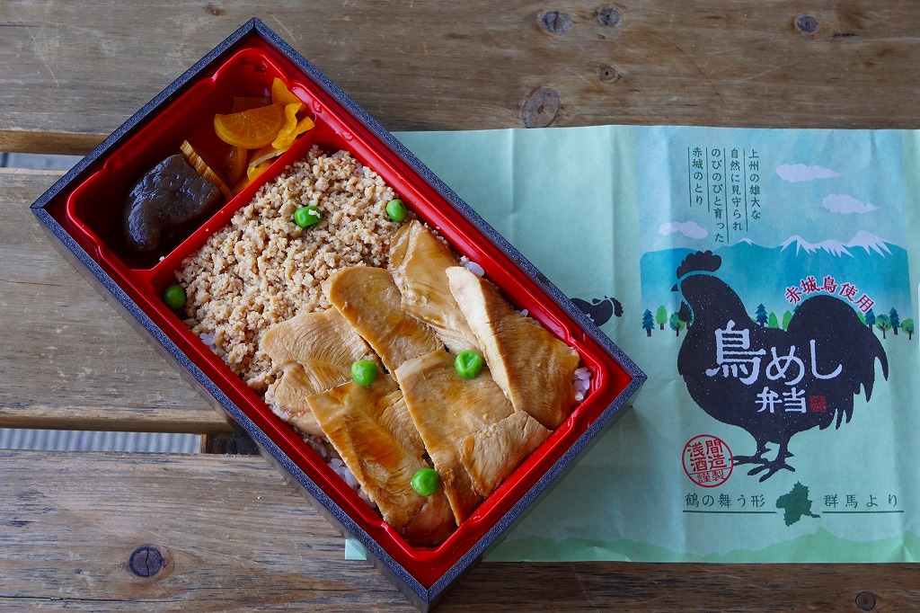 2016(平成28)年の秋までに長野原町内のドライブインで発売か。白飯を鳥むね肉と鳥そぼろで覆い、グリーピースで彩り、こんにゃくと漬物を添える。赤城の鶏と山を描く掛紙も付き、見た目は立派な駅弁で、淡泊に過ぎる風味は駅弁にない感じ。調製元は長野原で駐車場付き観光売店を営む酒造業者で、駅売店の撤去後は駅の隣の公共施設「長野原・草津・六合 ステーション」でも販売。