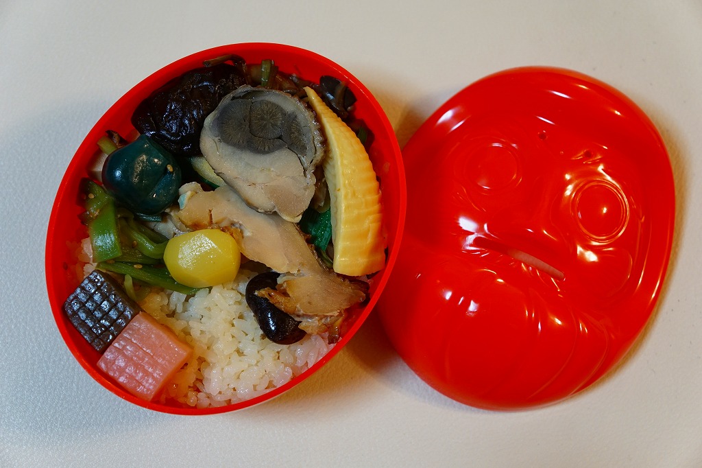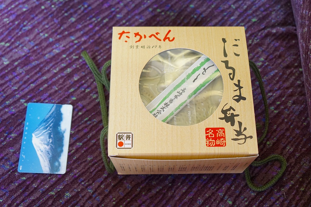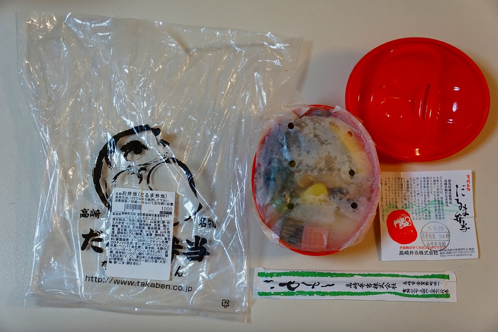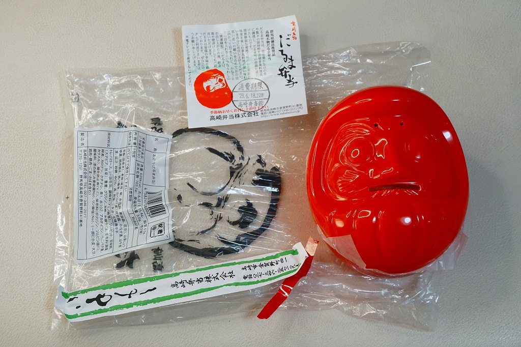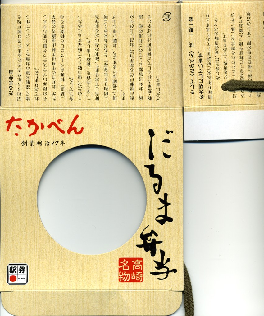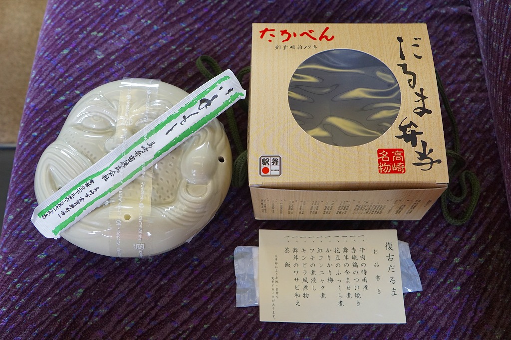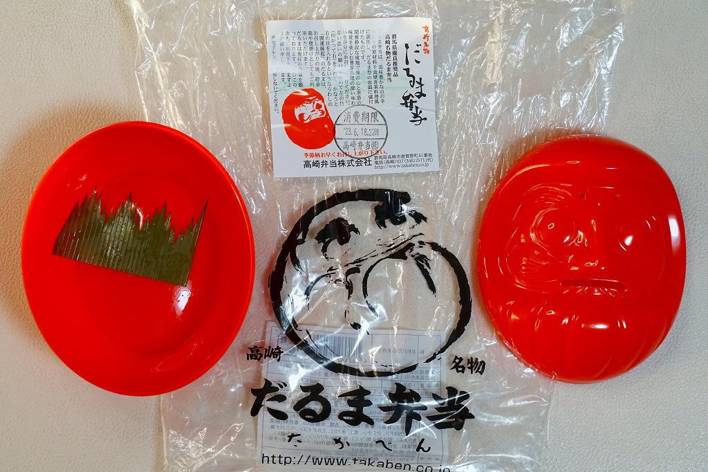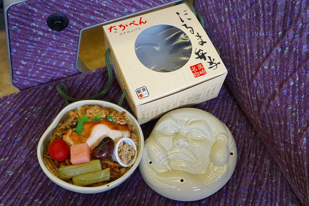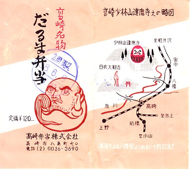 1960(昭和35)年に高崎駅で発売。高崎と日本を代表する、有名な駅弁。駅弁の名前は、だるまで有名な高崎市内の少林山達磨寺にちなむ。ダルマ型の真っ赤なプラ容器を使用、中身は群馬の山の幸ということで、茶飯の上をコールドチキン、鶏八幡巻、赤と黒のこんにゃく玉、シイタケ、タケノコ、山菜きのこ煮、山ごぼう漬、山くらげで覆い、小ナス漬と栗と花豆煮を添えるもの。価格は長らく900円であったが、2014年3月に1,000円へ値上げ、2019年2月1日から1,080円、2020年時点で1,100円、2023年4月から1,300円、2024年10月から1,400円。