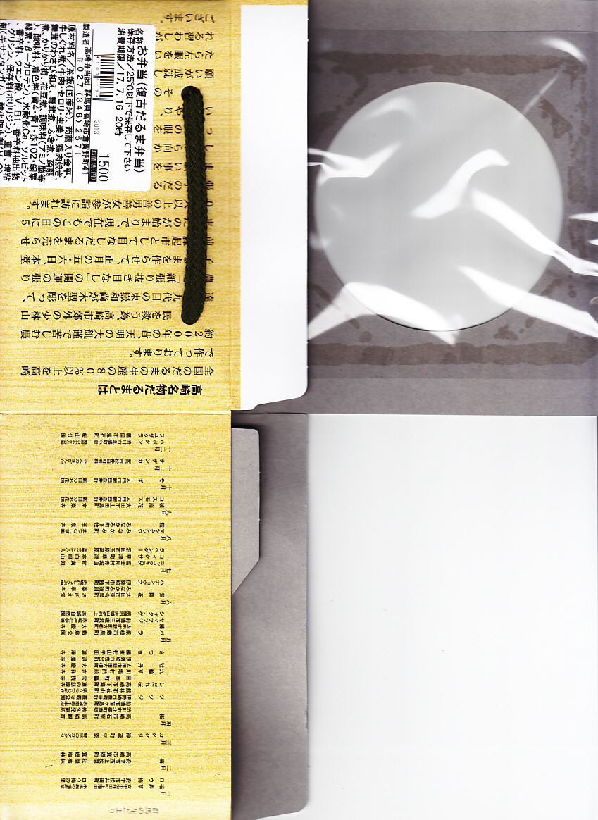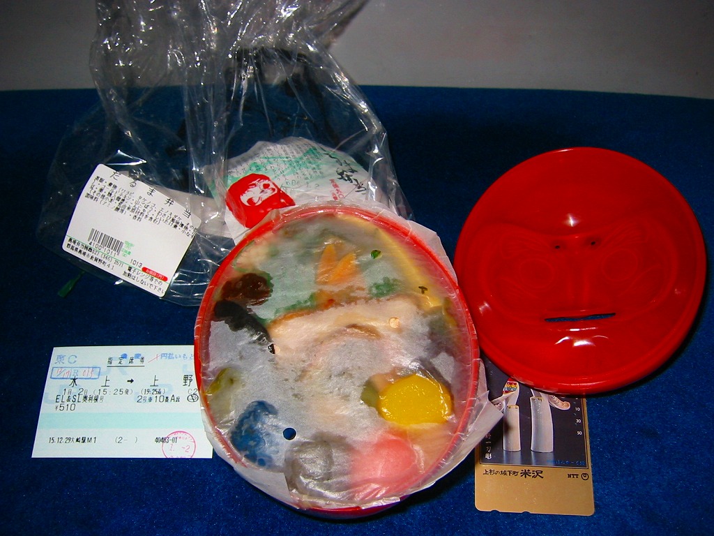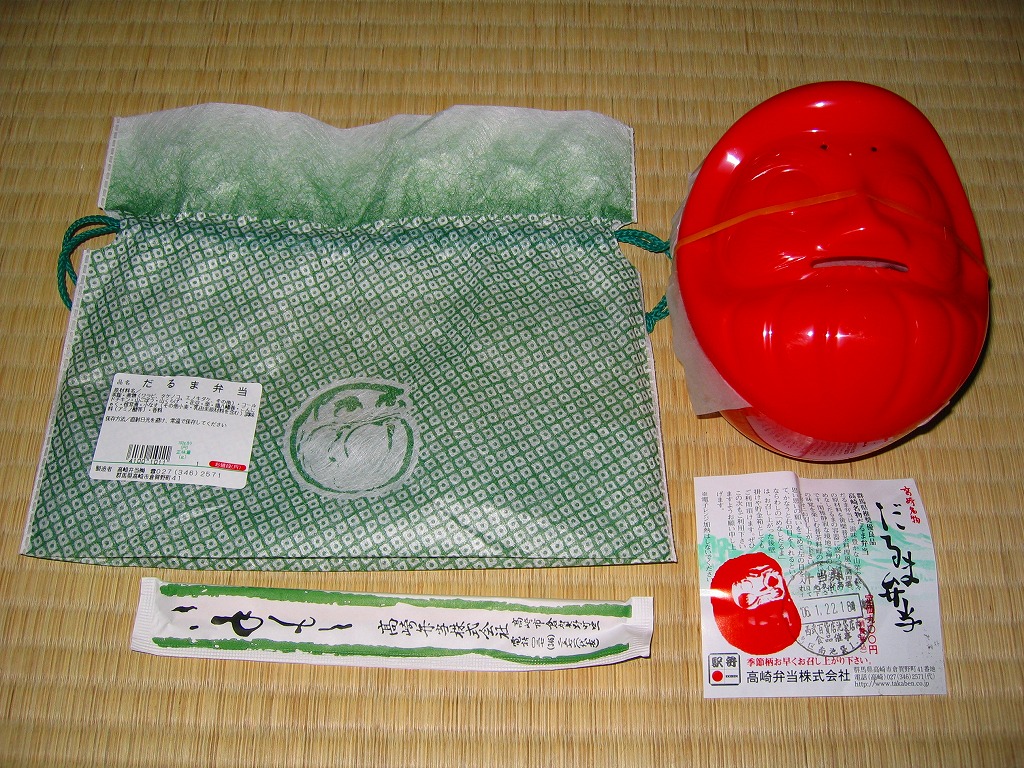 高崎駅でもスーパーやデパートの駅弁大会でもおなじみの、高崎名物だるま弁当。2006(平成18)年1月の西武百貨店池袋店での催事でも、だるま弁当・とりめし・はろうきてぃのだるま弁当の定番3種が実演販売されていたが、だるま弁当が見慣れない専用のきんちゃく袋に入っていたので買ってみた。これ以降、この袋には出会えていない。価格は2006年の購入時で、通常版と同じ900円。現存すれば、通常版と同じ1,400円で売られるのではないかと思う。