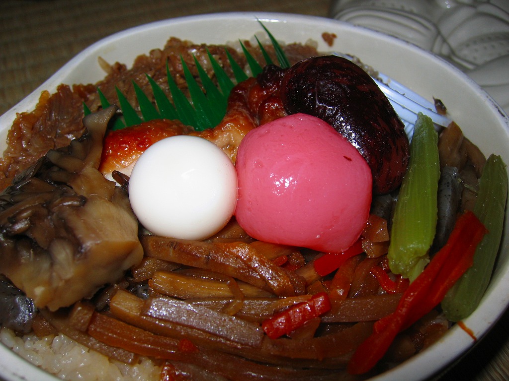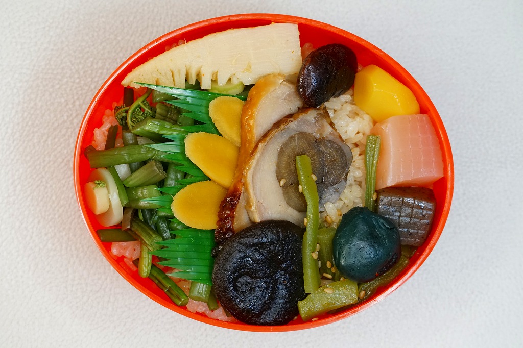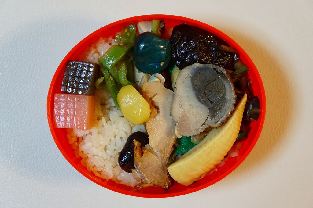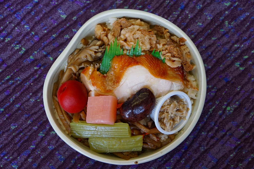 中身は茶飯を、牛肉の時雨煮、赤城鶏のつけ焼き、舞茸の含ませ煮、花豆のふっくら煮、かりかり梅、紅コンニャク煮、フキの煮浸し、キンピラ風煮物、舞茸のワサビ和えで覆うもの。地元群馬の産品を多用したコンセプトも、しっかり復刻。中身に鶏肉も牛肉も入っては、現行版のヘルシーさはないが、戦後の駅弁はむしろ高カロリーが求められていたため、その点でも実は復古調か。見栄えで驚かせ、風味は良好。価格は2017年の購入時で1,500円、2019年2月1日から1,650円。2019年10月に販売を休止、そのままなくなってしまった模様。