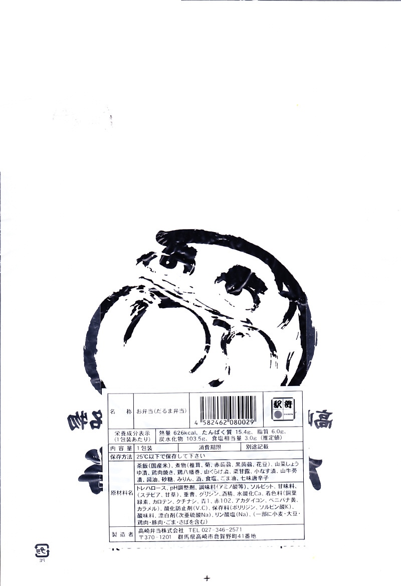 2016(平成28)年6月29日に購入した、高崎駅弁の袋。上記の2023年のものと変わらない。食品表示ラベルのレイアウトと記載事項は異なる。