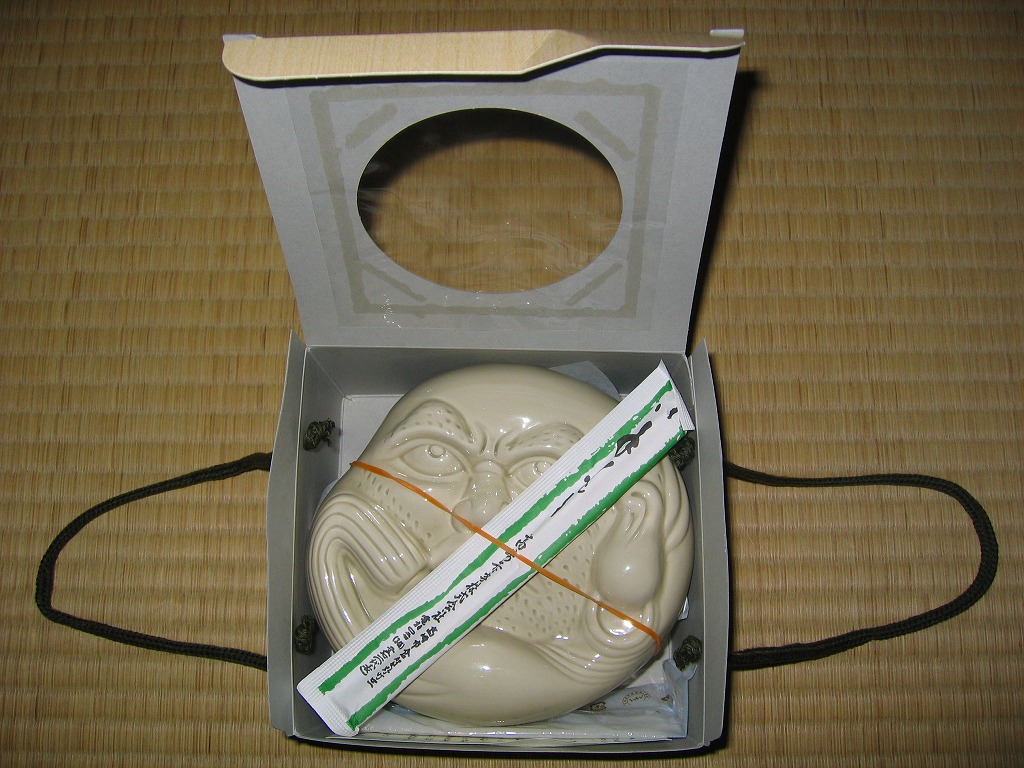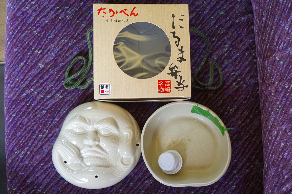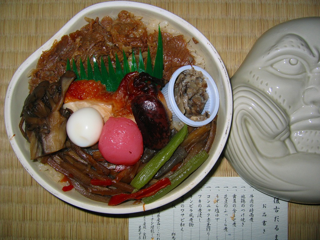 高崎の名物駅弁「だるま弁当」の復刻版で、2006(平成18)年5月1日から毎日30個を併売。34年前の1972(昭和47)年当時の「だるま弁当」の姿を復刻したという、達磨大師の顔を不気味に浮き出した陶器は、当時も今も子供が泣き出しそう。これに割りばしを添え、輪ゴムで留め、持ち運び用ひも付きの頑丈な紙箱に詰める。