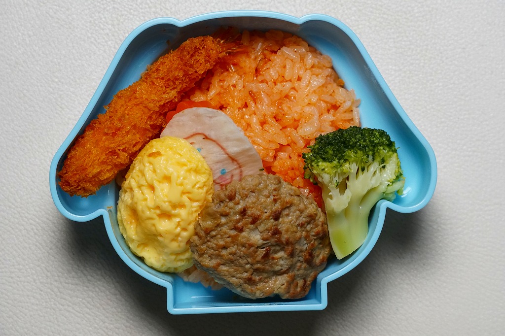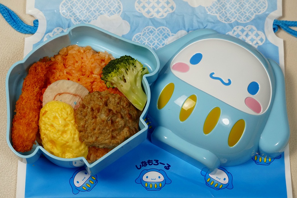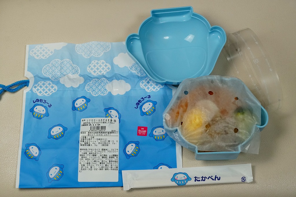 中身はチキンライス、エビフライ、ハンバーグ、ミニオムレツ、ブロッコリー、人参煮、シナモロールを描いた焼かまシート。伝統のだるま弁当とも、既存のハローキティのだるま弁当とも、まったく異なるお子様ランチ。だるまの姿を除いて上州群馬高崎とも駅弁とも縁のなさそうな姿なので、かわいいランチボックスを楽しむ商品だと思う。高崎駅で駅弁を売るコンビニで、その3種類のそろい踏みを見ることができた。