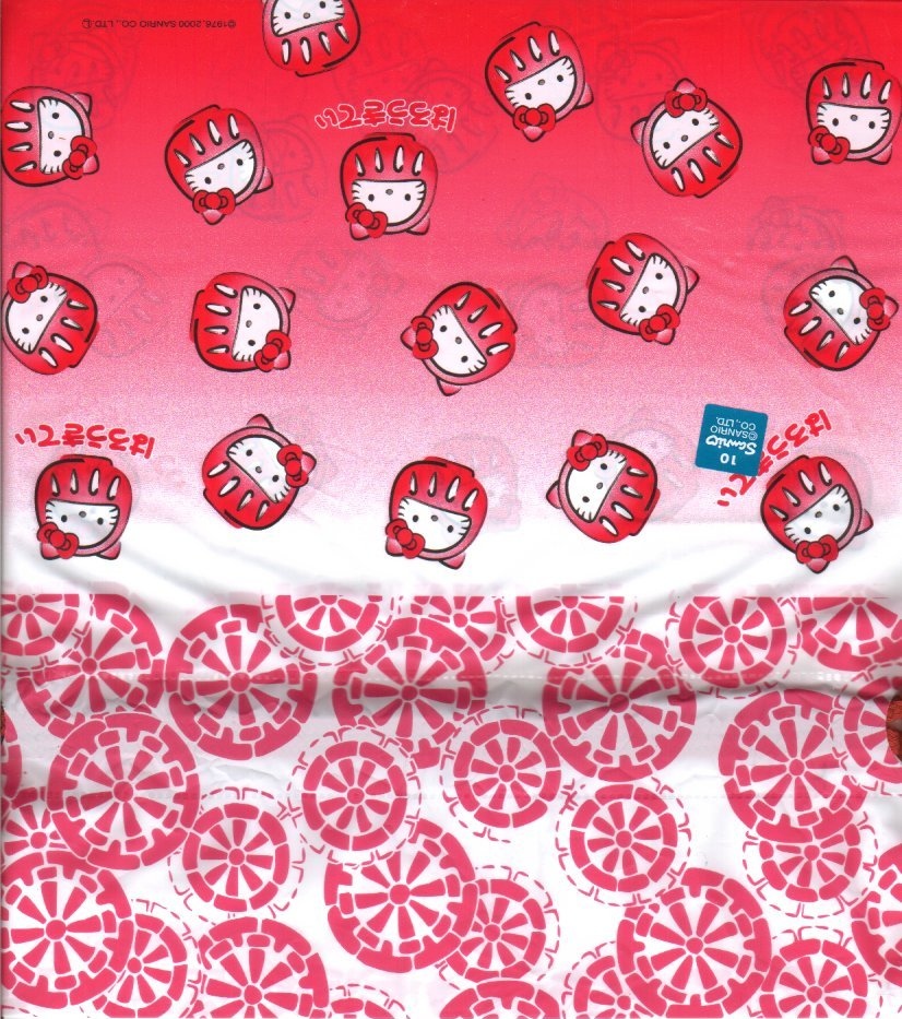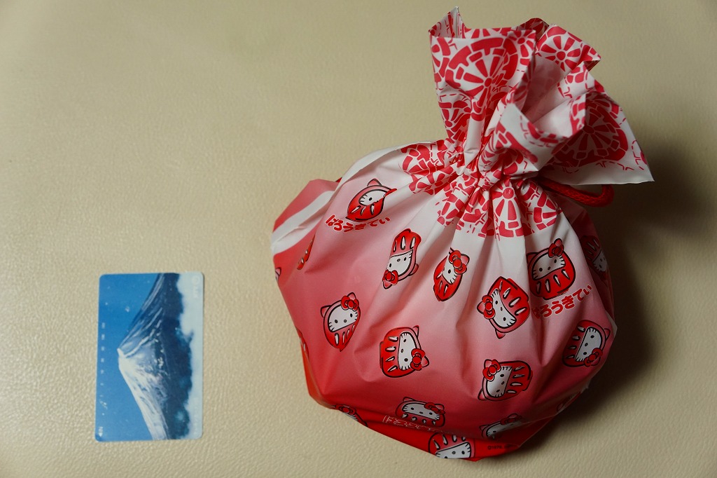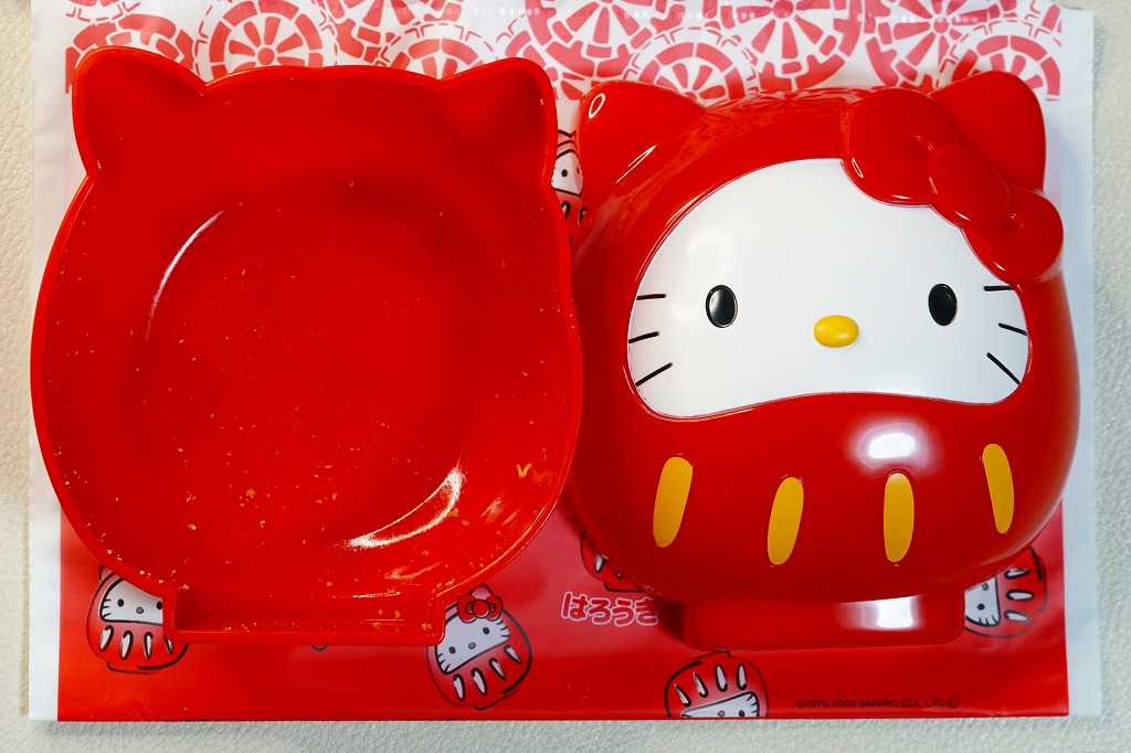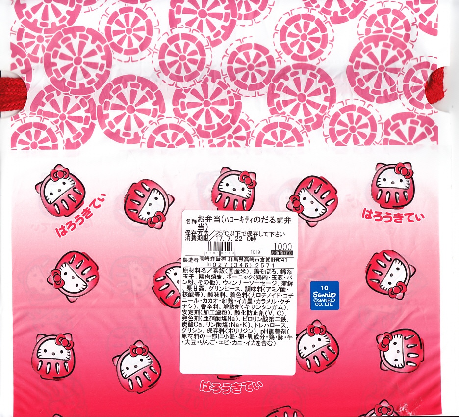 2001(平成13)年11月22日に購入した、高崎駅弁の袋。上記の駅弁「ハローキティのだるま弁当」と、袋や容器やキャラクターは変わらない。中身もほぼ同じであるが、鶏そぼろと錦糸卵の配置が異なったり、当時は山菜とキティ型こんにゃくが入っていたことがわかる。