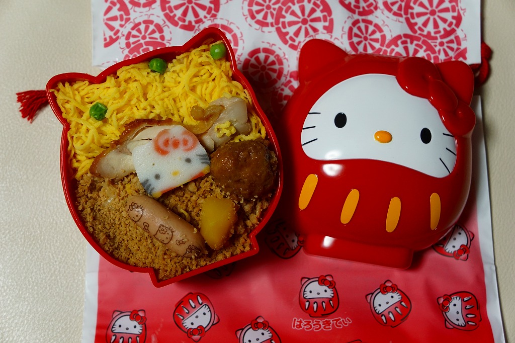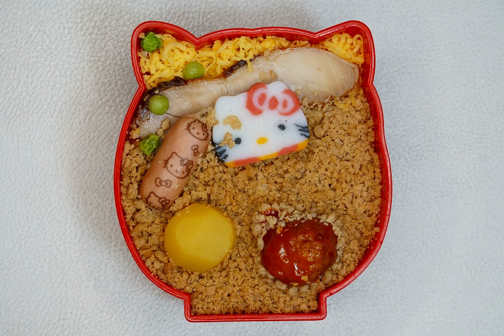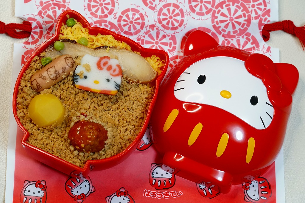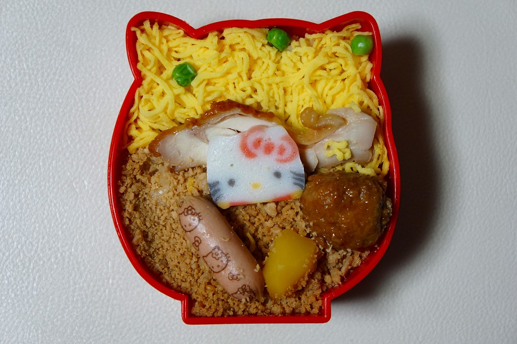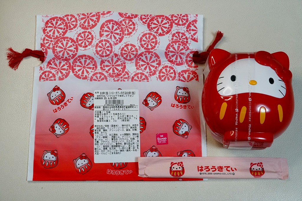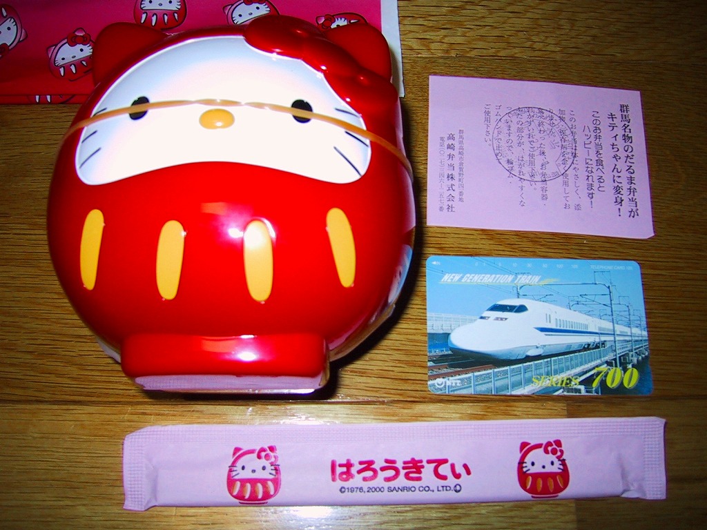 2000(平成12)年11月15日に高崎駅で発売。高崎駅の名物駅弁「だるま弁当」の容器と袋が、サンリオの人気キャラクター「ハローキティ」になった。このかわいらしいプラ容器に茶飯を詰め、鶏そぼろと錦糸卵で覆い、肉団子、鶏照焼、くり、キティちゃん柄のウインナーとかまぼこを載せる。そんな中身は同じく高崎駅で伝統の駅弁「とりめし」に近い。ハローキティの駅弁は、1997年の岡山駅弁やこの高崎駅弁が出た頃には、札幌駅から小倉駅まで各地に普及したが、現存するうえ20年変わらないのは、この高崎駅弁だけ。価格は2000年の発売時で900円、2014年3月から1,000円、2019年2月から1,080円、2020年時点で1,100円、2022年時点で1,300円、2023年4月から1,380円、2024年10月から1,450円。