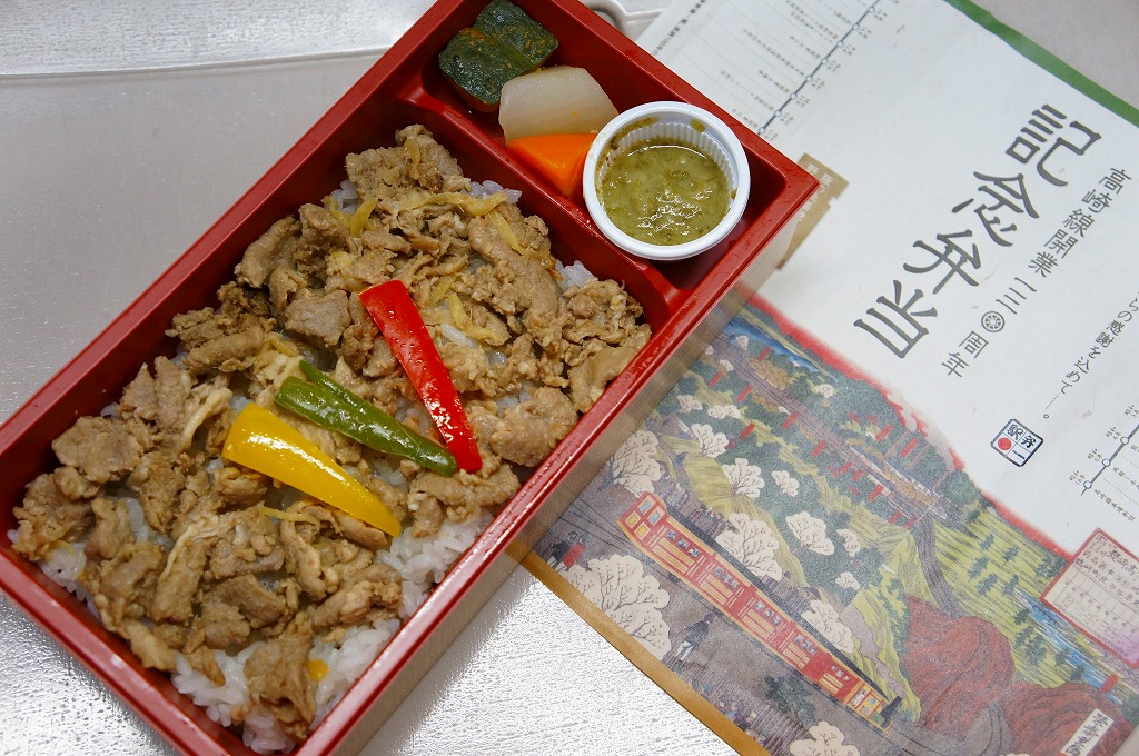 肉の薄毛具合は気になったが、風味と食感はまあまあ柔らかい。そんな中身よりも、掛紙のデザインが良い。開業から現在までの主要年表と、全線開業当時の錦絵で、美観と資料性を兼ね備えた。また、記念の駅弁にしてはずいぶんと価格が安い。