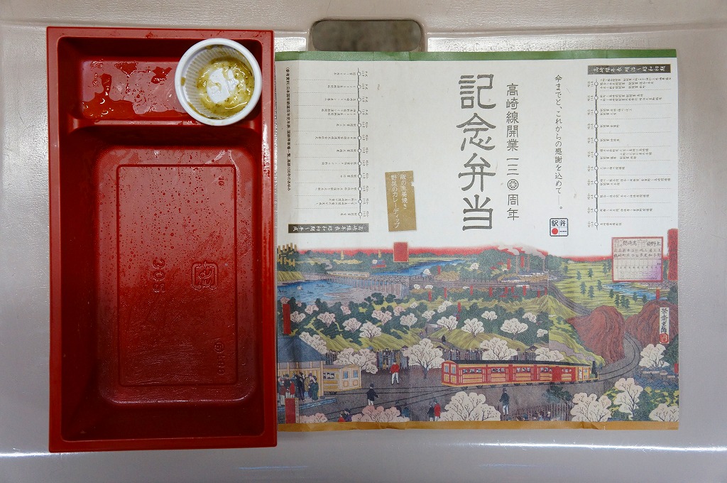 高崎駅は2005(平成17)年のJR東日本「ステーションルネッサンス」、言い換えれば駅の商業施設化と出改札の縮小整理に伴う構内改装に伴い、かつては乗換通路上の目立つ位置にあった駅弁屋台が一掃されてしまった。とりあえず在来線改札の外にひとつ、駅弁売店を見つけてこれを買えたが、これで駅弁の駅離れや街弁化がまた進んだはず。