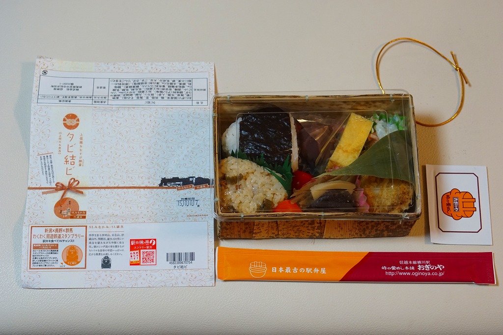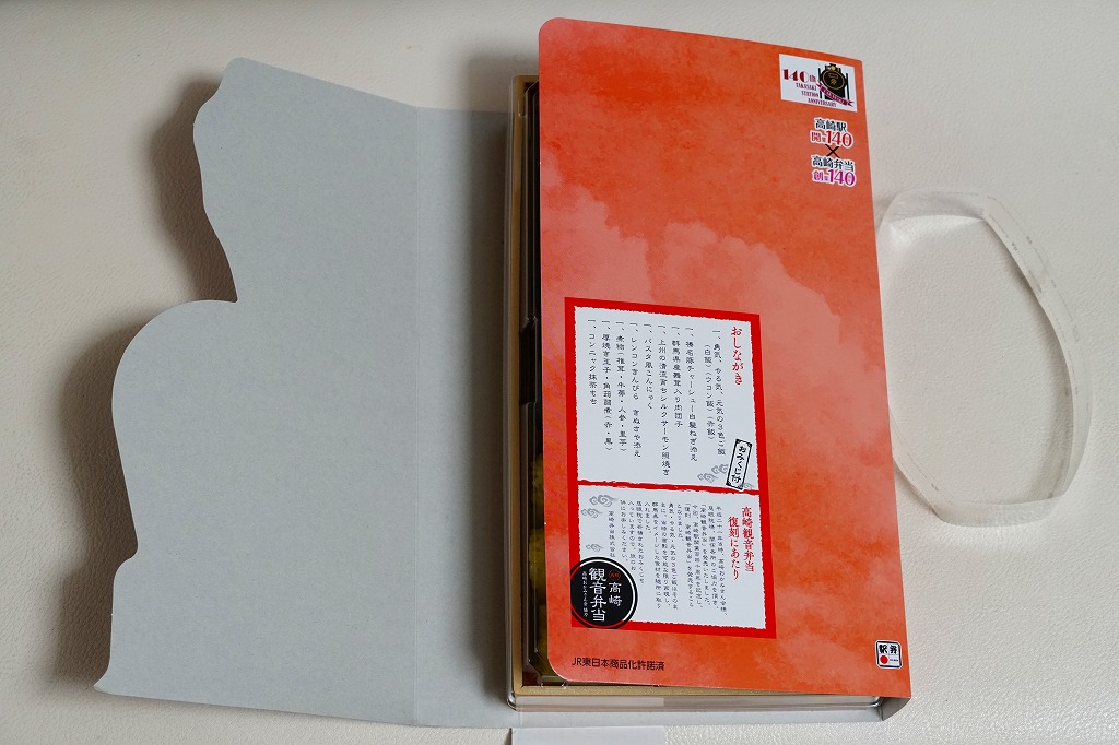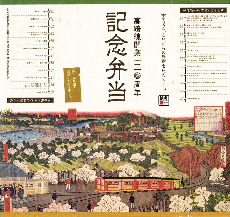 2024(令和6)年4月1日から21日まで、高崎駅や東京駅と、群馬県や長野県の「おぎのや」店舗で販売。駅弁の日に合わせ、日本鉄道構内営業中央会の会員のうち31社が各社おすすめ駅弁に共通ノベルティ「千社札風カード」を添付して期間限定で販売した駅弁の、高崎駅バージョン。販売期間は5月6日まで延長されたという。