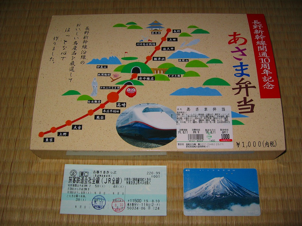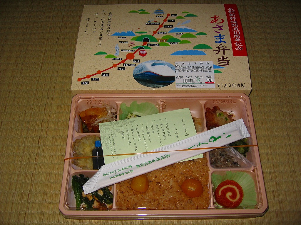 「あさま弁当」という名前の駅弁は過去にも存在したが、今回は長野新幹線開業10周年の記念駅弁か。東京〜長野間の簡単すぎる路線図を描いたボール紙の枠に、プラ製のふたが透明な惣菜容器をはめる。中身は栗御飯の周りを豚角煮、舞茸天、クルミと菜の花の和え物、長芋磯辺揚、イワナ塩焼、鯉竜田揚、アンズなると巻など、独特のおかずで囲むもの。お品書きも備わり、山の幸を体感できる。