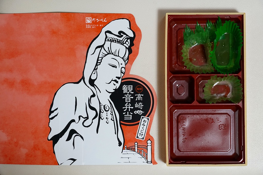 復刻なので、容器や中身は当時のものとそっくり。高崎観音を大きく描いた長い容器に、「勇気(白飯)、やる気(ウコン飯)、元気(赤飯)の3色ご飯」、榛名豚チャーシュー白髪ねぎ添え、群馬県産舞茸入り肉団子、上州の清流育ちシルクサーモン照焼き、パスタ風こんにゃく、レンコンきんぴらのきぬさや添え、煮物、厚焼き玉子と角こんにゃく煮、コンニャク抹茶もちを詰める。おしながきはふたに直接印刷し、おみくじの添付は以前と同じ。ちょっと毒々しい御飯の色が印象に残る、おかずたっぷり幕の内。