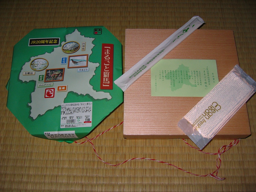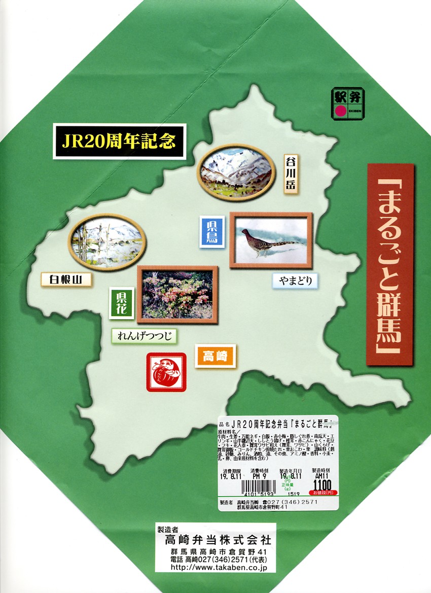 「まるごと群馬」を名乗る駅弁は過去にも存在したが、今回は国鉄の分割民営化によるJR各社の発足20周年を記念して2007(平成19)年に発売。けっこう大きな正方形の木目調容器に、群馬県土をシルエットで描くだいぶ大きな掛紙をかける。