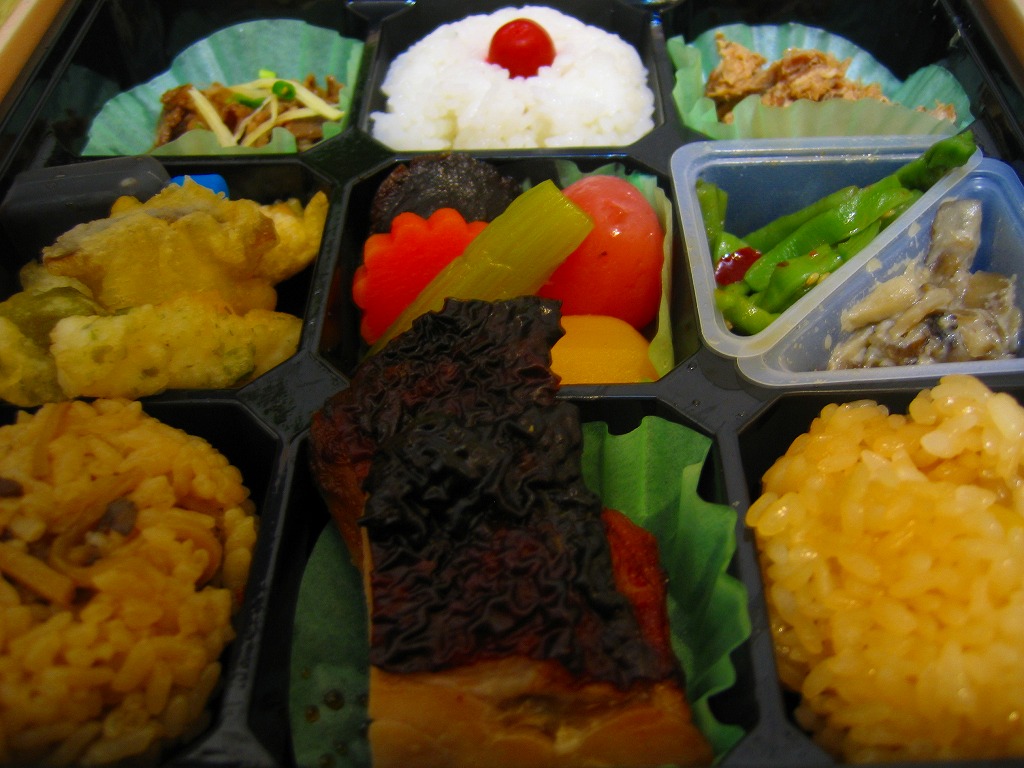 9区画に分かれた中身は、日の丸御飯、舞茸御飯、栗おこわ、鶏照焼、エリンギや山芋などの天ぷら、豚しぐれ煮、牛生姜風味、こんにゃくや煮物、山くらげと舞茸煮。山の煮物や揚げ物や和え物が詰まり、高価に見合う雰囲気と風味があると思う。