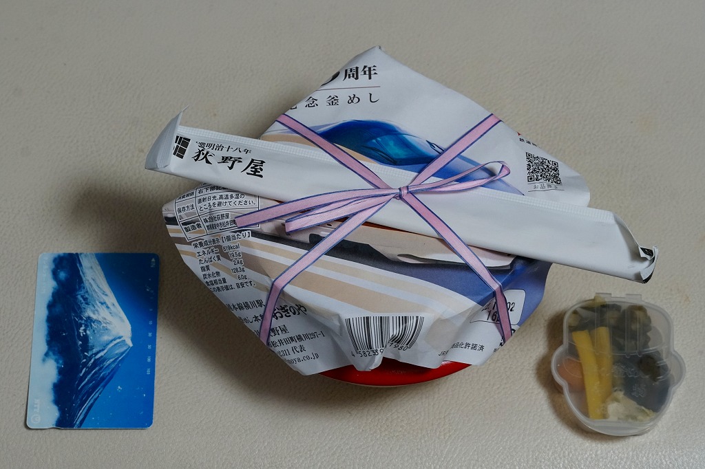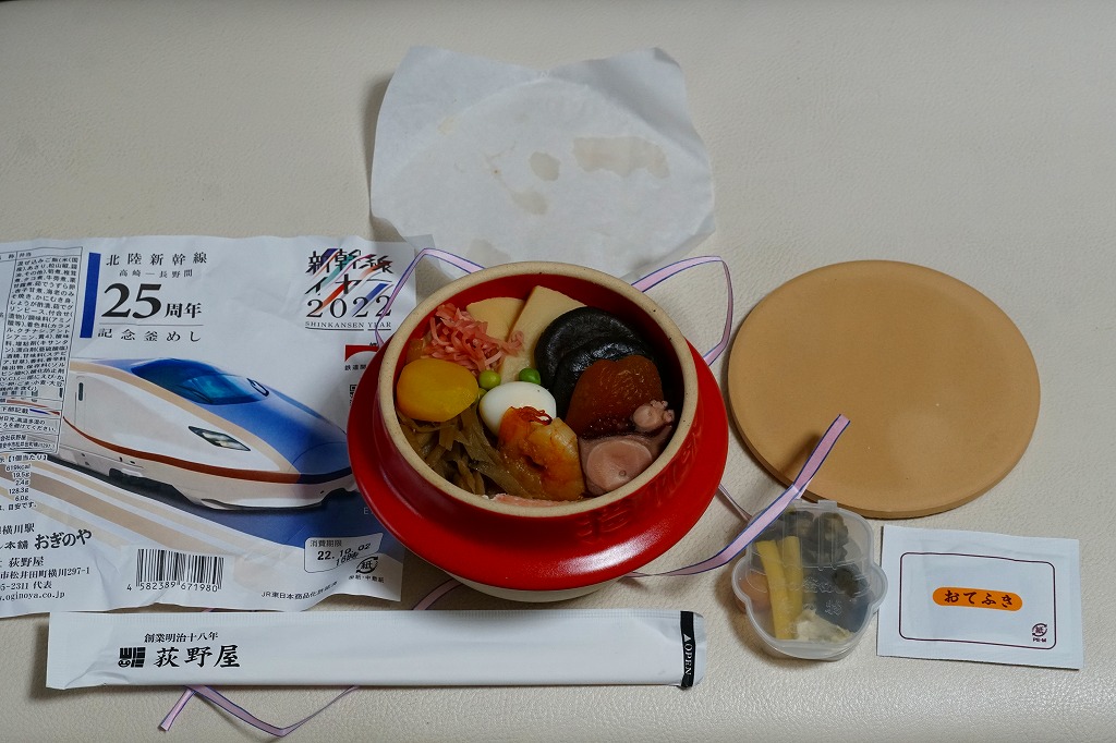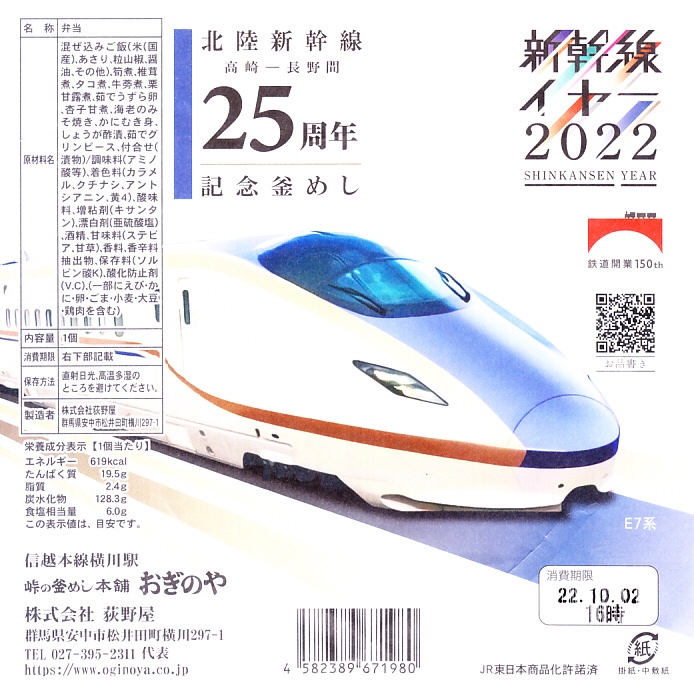 2022(令和4)年10月1日に、高崎駅と東京駅と軽井沢駅で発売、12月31日まで販売。掛紙にあるとおり、北陸新幹線の高崎−長野間の開業25周年を記念した駅弁で、発売日からのJR東日本の駅弁キャンペーン「駅弁味の陣2022」にエントリー。横川駅の名物駅弁「峠の釜めし」と同じ、益子焼の容器に正方形の掛紙をかけて、漬け物のプラ容器を添えて、ひもで十字にしばるスタイル。容器は赤みがかり、掛紙には現在の北陸新幹線電車のイラストを使う。