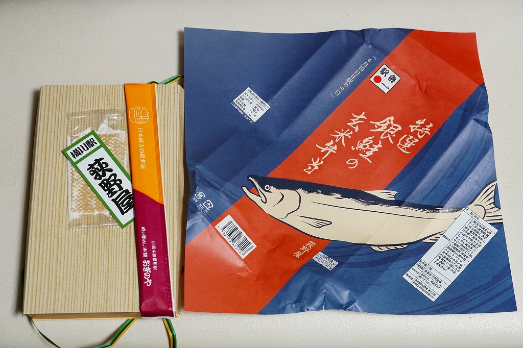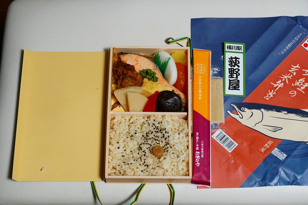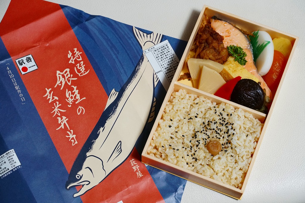 玄米混じりでなく玄米そのものの日の丸御飯に、鮭塩焼、鶏ごぼう唐揚げ、玉子焼、しいたけ、たけのこ、パプリカ、ごぼう、かまぼこ、あんず、栗きんとん、きゅうり漬け。令和の新作なのに、見た目は昭和あるいは戦前に遡れるかもしれない、古風なつくりにみえる。1974年生まれの横川駅弁「玄米弁当」の、おかずを充実させた感じ。荻野屋の期間限定の高崎駅弁なので、もう二度と売られないのではないかと思うが、古風な駅弁か老舗の仕出し弁当のような肩書きで、経木折に詰めて残したいレシピだと思った。