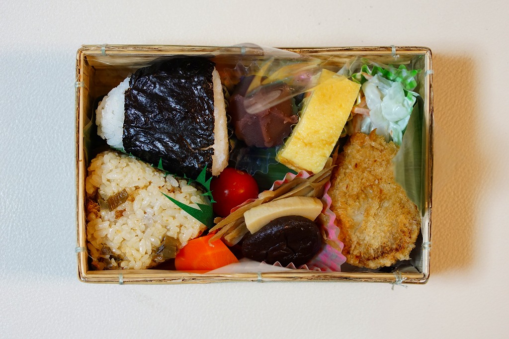 透明なふたをした竹皮編み容器の中で、透明なシートを介して置かれる中身は、下仁田のネギとコンニャクのおにぎり、秋間梅林の梅干しのおにぎり、トンカツ、玉子焼、こんにゃくサラダ、峠の力餅などで、たしかに上州っぽい内容。