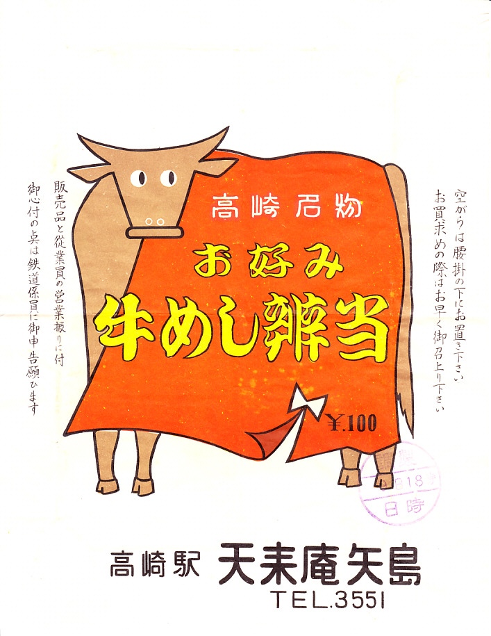 1950年代の調製と思われる、昔の高崎駅弁の掛紙。調製元は1958年に合併し高崎弁当となる前の、高崎駅の駅弁屋。牛肉を名乗る駅弁としては最初期のもので、外食券の表記がないので昭和30年代のものだろう。販売は数年で終えた模様。
