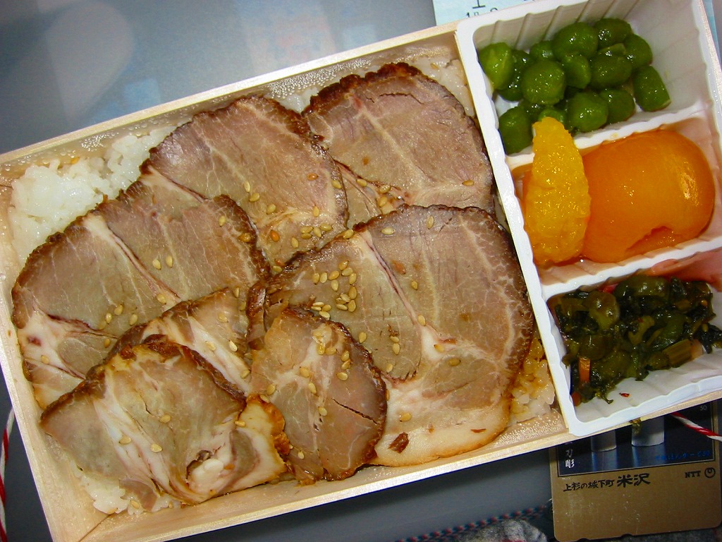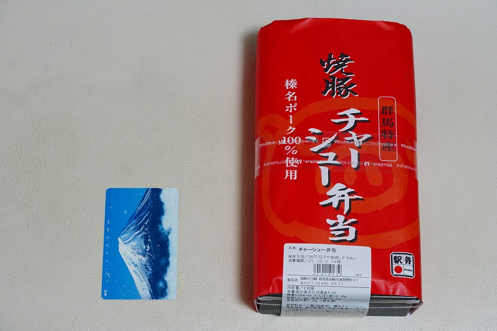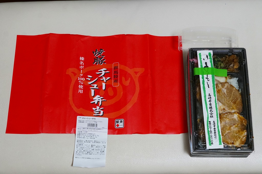 2003(平成15)年8月に発売。長方形の容器に白飯を詰め、榛名ポーク100%使用をうたう焼豚チャーシューで覆い、マイタケ佃煮、野沢菜漬け、甘酢生姜を添える。つまり豚丼で、駅弁ではあまり見られないチャーシュー弁当。肉の風味が独特で、お肉の駅弁らしからぬ淡泊な味のチャーシューが、輸入物ピーナツバターのようにすっと舌に溶けていく。価格は2003年の発売時で800円、2015年時点で900円、以後はこの常温版はしばらく売られなかったようで、2021年の購入時で1,000円、のちに1,200円、2024年10月から1,300円。