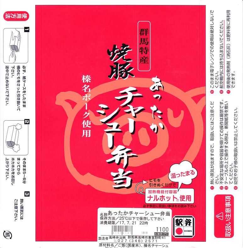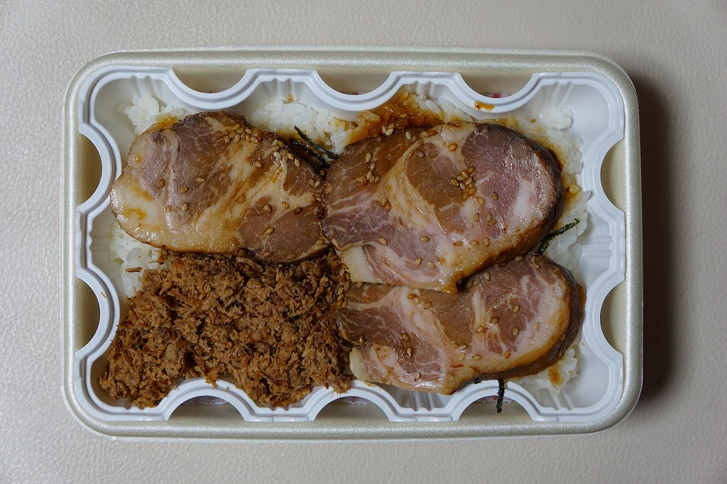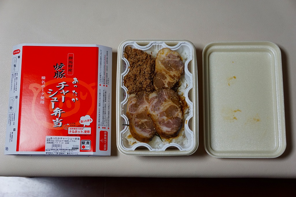 上記の駅弁「焼豚チャーシュー弁当」の、加熱機能付き容器入りバージョンで、2015(平成27)年までに発売か。長方形の容器に白御飯を敷き、たれをかけ、榛名ポークの焼豚チャーシューを3枚と豚そぼろだけで覆うという、潔い中身。こちらのチャーシューは上記のピーナツバター味でなく、高価なラーメンに載せているような、とてもトロトロなもの。一方で味付けが薄いので、ラーメンでなく弁当を食べている雰囲気であった。価格は2017年の購入時で1,100円、2019年2月から1,250円、2020年時点で1,280円。2021年までの販売か。