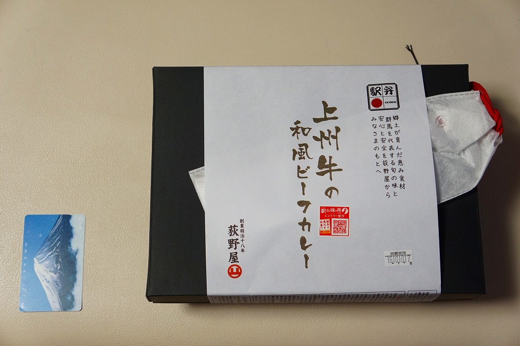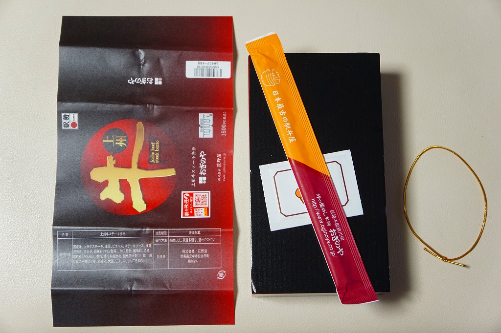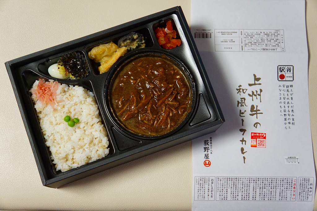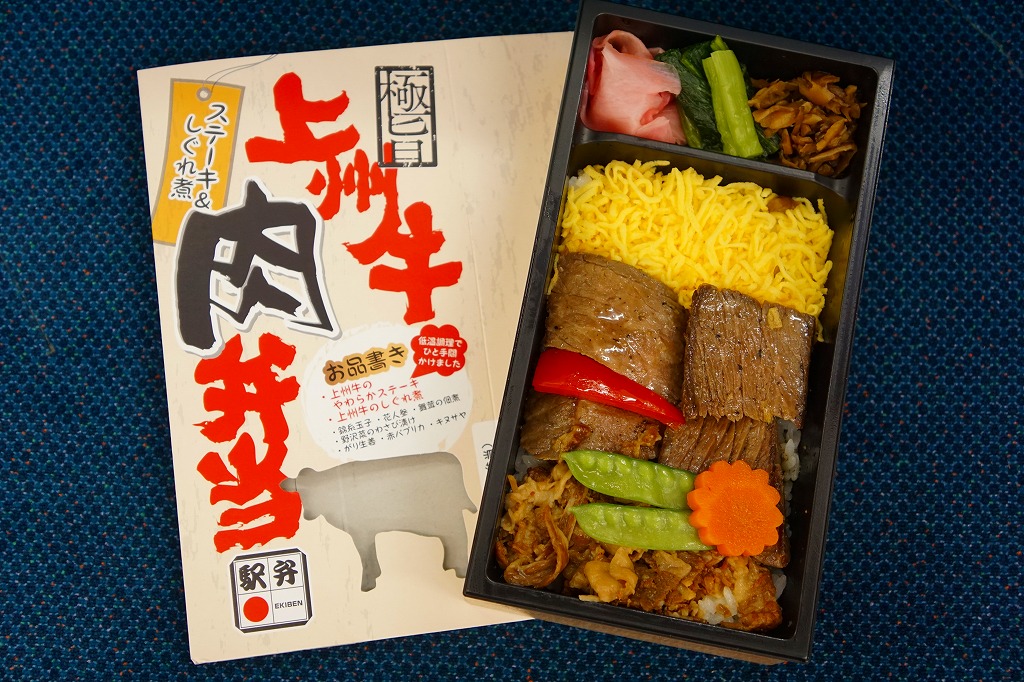2013(平成25)年3月29日の発売。白御飯に牛肉煮を合わせる、全国各地で相次いて出現する人気の牛肉駅弁と違い、これは御飯の上を錦糸卵、上州牛ステーキ、上州牛しぐれ煮の3ブロックで覆うもの。これにマイタケ佃煮、野沢菜のわさび漬、生姜酢漬を添える。