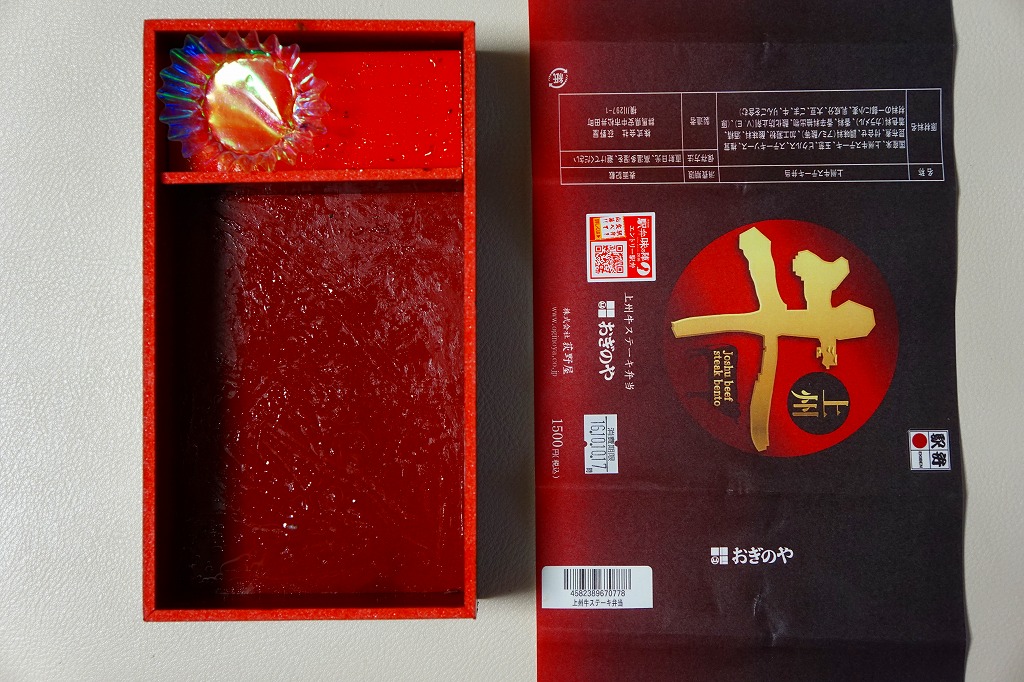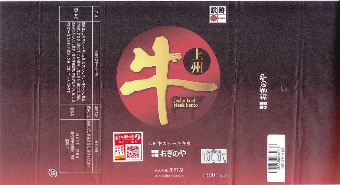 2016(平成28)年5月に高崎駅で発売か。同年10月にはJR東日本の駅弁キャンペーン「駅弁味の陣2016」にエントリー。白御飯を牛ステーキで覆い、昆布煮とピクルスを添える。掛紙と容器の色を含め、牛肉の見た目はローストビーフで、食べれば表面を炙っただけの牛焼肉。血合いも脂の重さもなく、柔らかく薄切りのため食べやすく、タレというかペーストの味も肉の香りを活かす感じ。これは例えば味で武雄温泉に対抗できる、とんでもなくうまい牛肉弁当。2017(平成29)年5月に終売の模様。