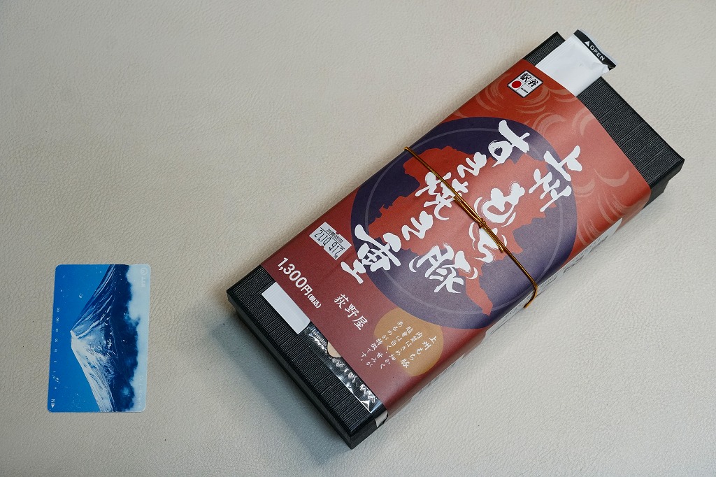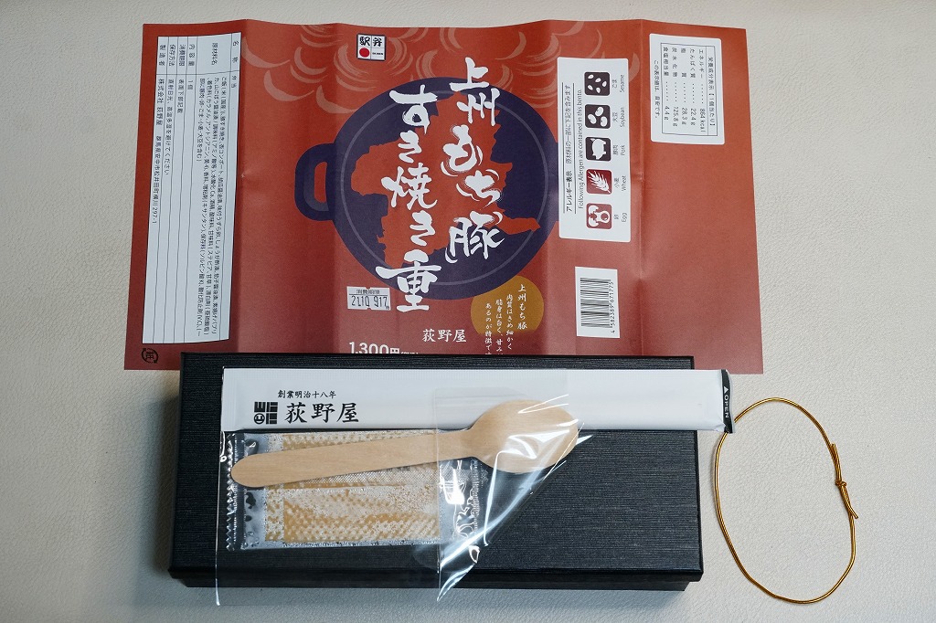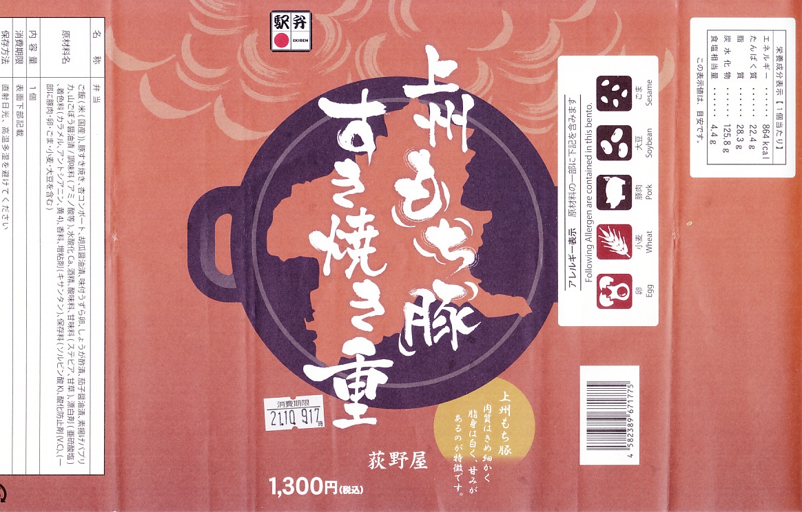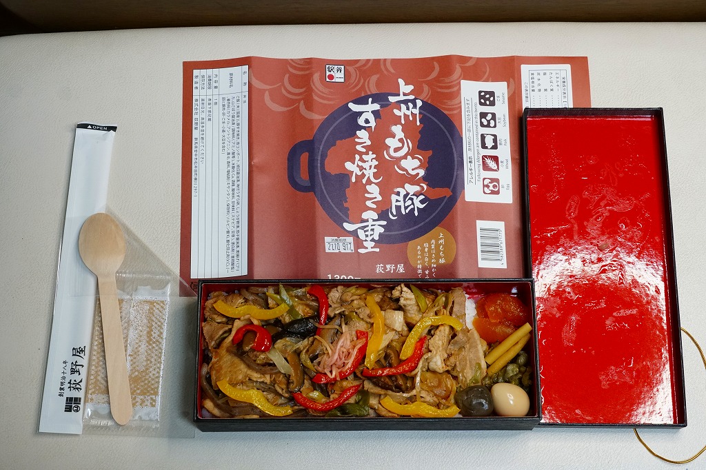 2021(令和3)年10月1日に東京、大宮、高崎、軽井沢の各駅で発売し、高崎駅の駅弁としてJR東日本の駅弁キャンペーン「駅弁味の陣2021」にエントリー。駅弁味の陣に新作を投入し、人気投票期間が終わる11月をもって売り止めるのは、荻野屋の高崎駅弁として例年どおりのやり方。紙製の黒箱に白飯を詰め、豚肉のすき焼きで覆い、うずら卵と各種の漬物にあんずのコンポートを添える。肉はまるで野菜炒めのようで、上州もち豚にナス、しいたけ、パプリカ、こんにゃく、ししとう、ネギなどを混ぜ、具に分量と彩りと味わいを添加した。今回は価格もそれほど高価でなく、こんなに良い駅弁を2か月で売り止めるのはもったいないと思うのも、やはり例年どおり。高崎駅で買えなかったので、東京駅で購入した。今回は珍しく、年明けまで販売した模様。