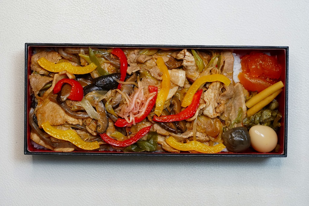 長方形の黒い容器に割りばしを置いて輪ゴムで留め、これをまるごと包装紙で包む。赤いプラ製トレーに収まる中身は、白御飯の上を上州麦豚のロースの焼肉としらたきで覆い、つぼ漬と葉唐きゅうりを添えるもの。鶏肉の弁当ではないけれど登利平ブランドの商品。薄く広い豚肉がトリ並みにあっさりした異色作。価格は2009(平成21)年の購入時で780円、2017年時点で830円、2023年時点で900円。