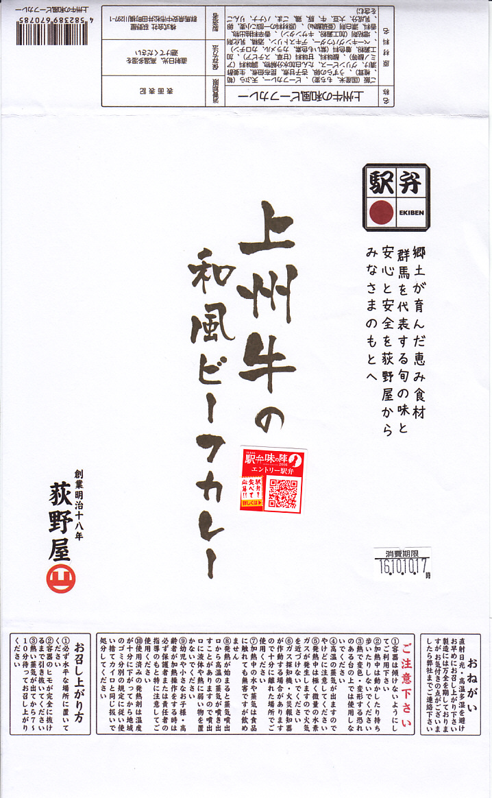 JR東日本の駅弁キャンペーン「駅弁味の陣2016」へのエントリーに合わせて、2016(平成28)年10月1日の発売。容器が大きくなる加熱機能付きにしても、駅弁とは思えぬ巨大な箱。中身は麦の混ぜ御飯と、ふた付きの丸い容器に収めたカレールーと、天ぷら、佃煮、うずらの卵、福神漬。ハイパワーな加熱機能で、アツアツのカレーができあがる。箱の大きさと、プラ製スプーンの貧弱さで、これは列車内ではなく、自宅や宿などまともな食卓と食器がある場所で食べるものだと思った。ルーをちゃんとすくうことができれば、これはおいしいエノキカレー。会期とともに11月限りで終売。