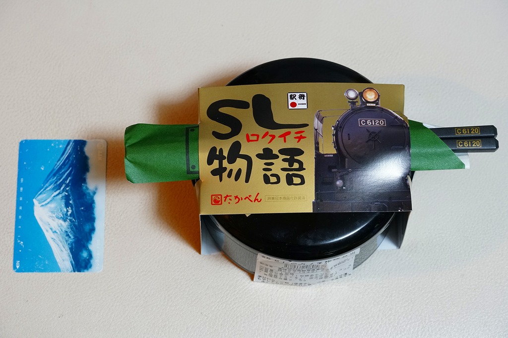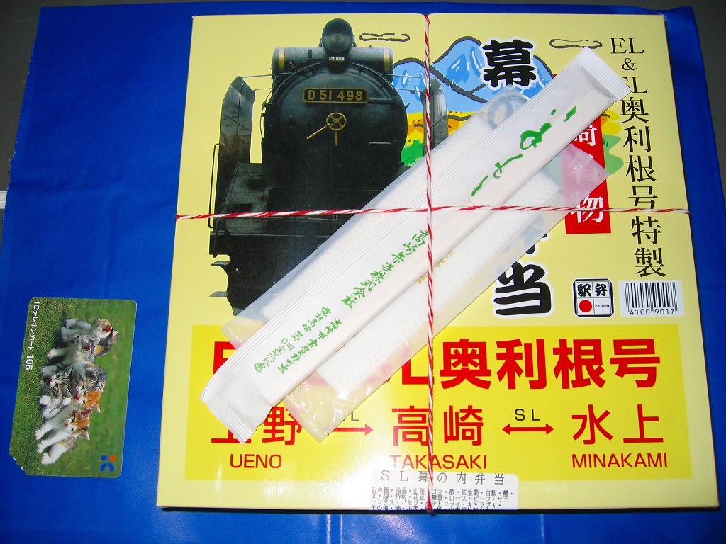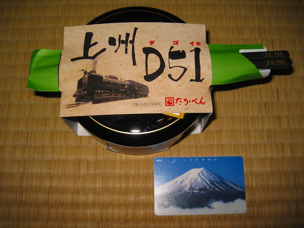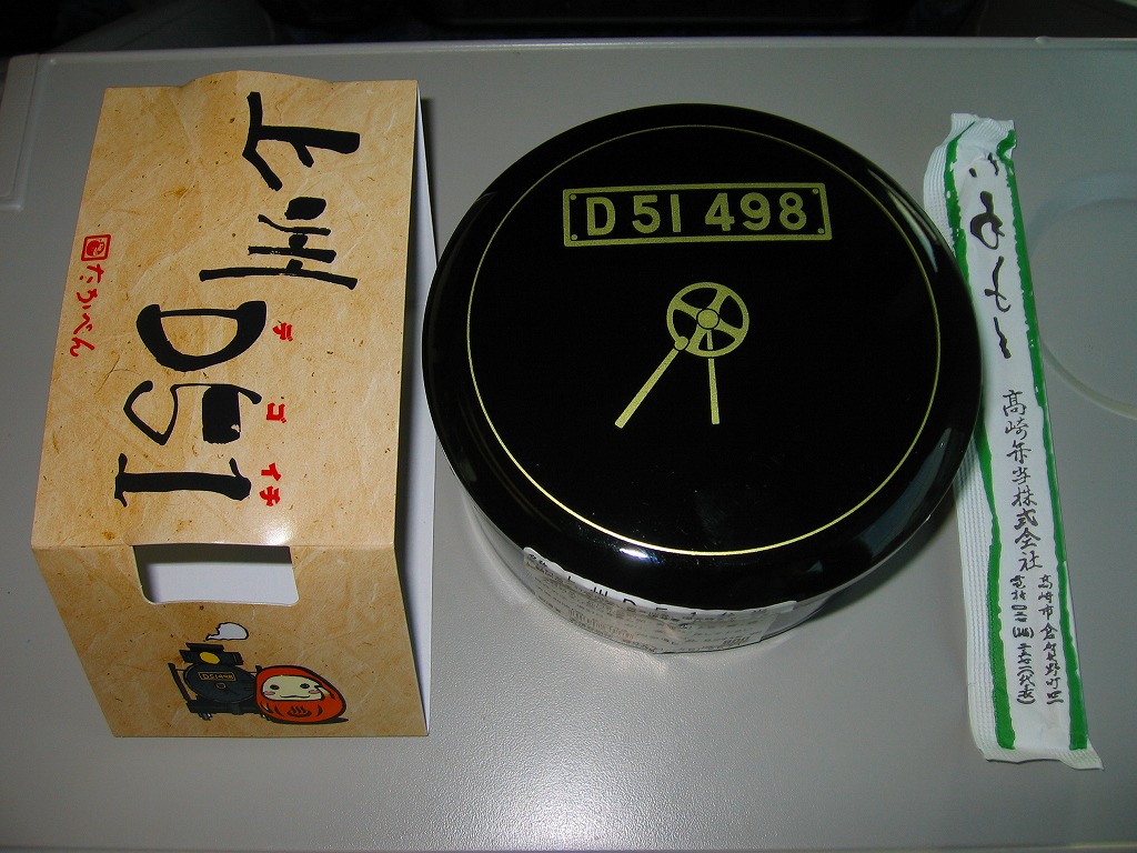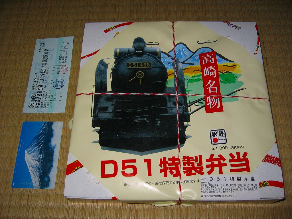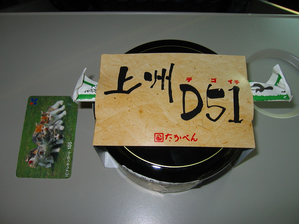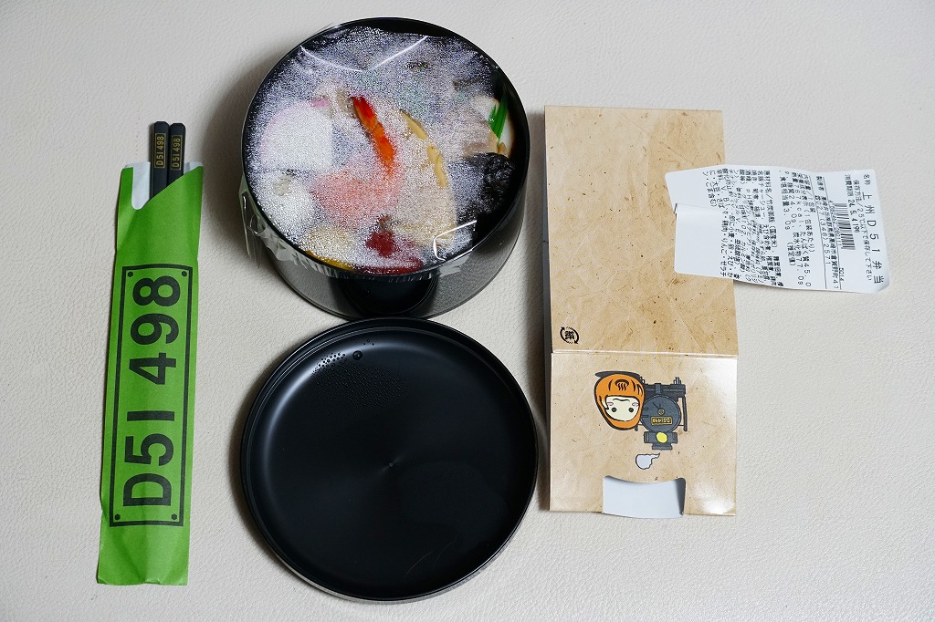 上記の駅弁「上州D51弁当」の、2008(平成20)年の発売時や購入時の姿。容器と中身は上記の2011年のものと変わらない。当時は特製のお箸でなく高崎駅の駅弁に共通の割りばしを付け、スリーブの上面でなく側面にSLがいた。