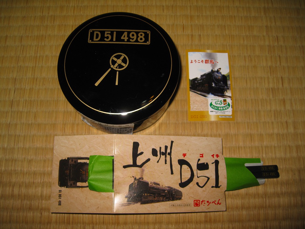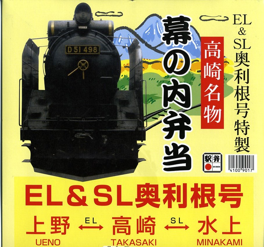 1990年代から上越線で親しまれる観光列車「EL&SL奥利根号」の、2008(平成20)年夏の運転開始に合わせて、同年7月19日に発売。駅弁の名前は「上州D51弁当」とも。北海道の疑義駅弁を含む海鮮弁当でよく使われるタイプの丸いプラ容器を真っ黒にして、フタを縁取りナンバープレートとハンドルを描くだけで、蒸気機関車の煙室扉つまり前面に見えてくるデザイン。これを駅弁の名前と機関車のイラストを描くスリーブに収め、ナンバープレートを印刷した黒いお箸を付ける。