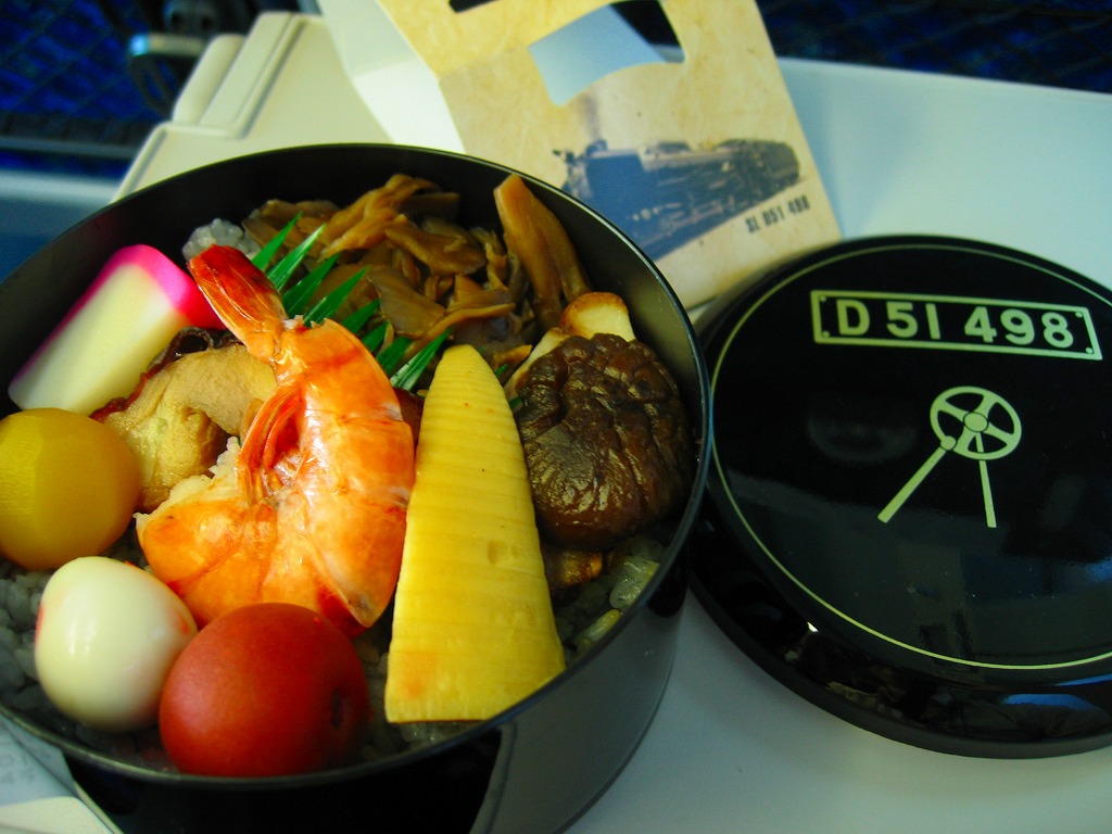 2005(平成17)年の夏休み期間中限定に売られた駅弁。23センチ四方もある巨大な正方形ボール紙容器には、臨時列車名と蒸気機関車が大きく描かれる。中身はひつまぶし、岩魚鮨、稲荷寿司の三種の御飯に、ローストビーフとポテトフライ、舞茸天・焼き魚・蒲鉾・玉子焼に付け合わせ。脈絡のない内容はともかく、容器の大きさに負けてスカスカな見栄えはいただけないが、他に流用ができない専用の紙箱で記念駅弁を用意する姿勢はうれしいもの。