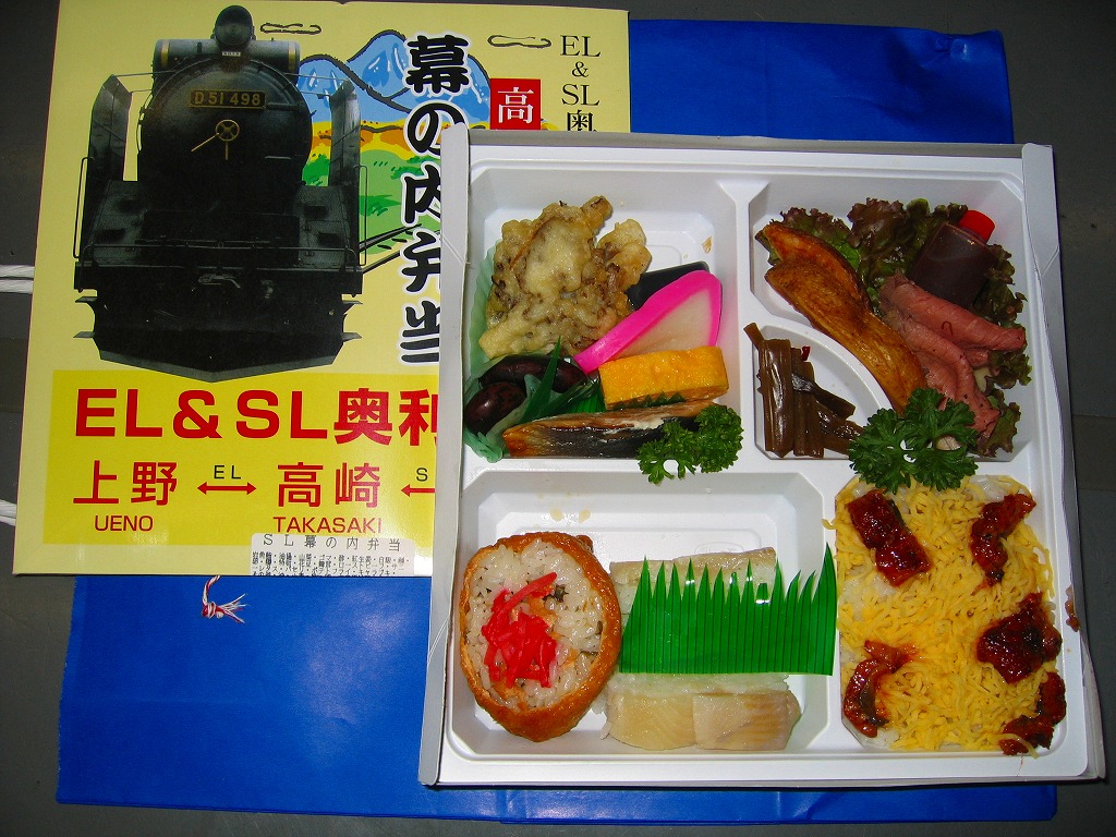 名前は異なるが、つまり下記の駅弁「EL&SL奥利根号特製高崎名物幕の内弁当」と同じもの。専用紙箱が市販紙箱と専用掛紙の組み合わせに変わり、中身のいくらいなりが山菜いなりに変わっている。相変わらず個々の食材は見栄えも風味も良く、でも内容に脈絡がなく詰め方が雑な、食事というよりおつまみセットの雰囲気な記念駅弁。上記のプラ容器の駅弁の発売により、役目を終えた模様。
