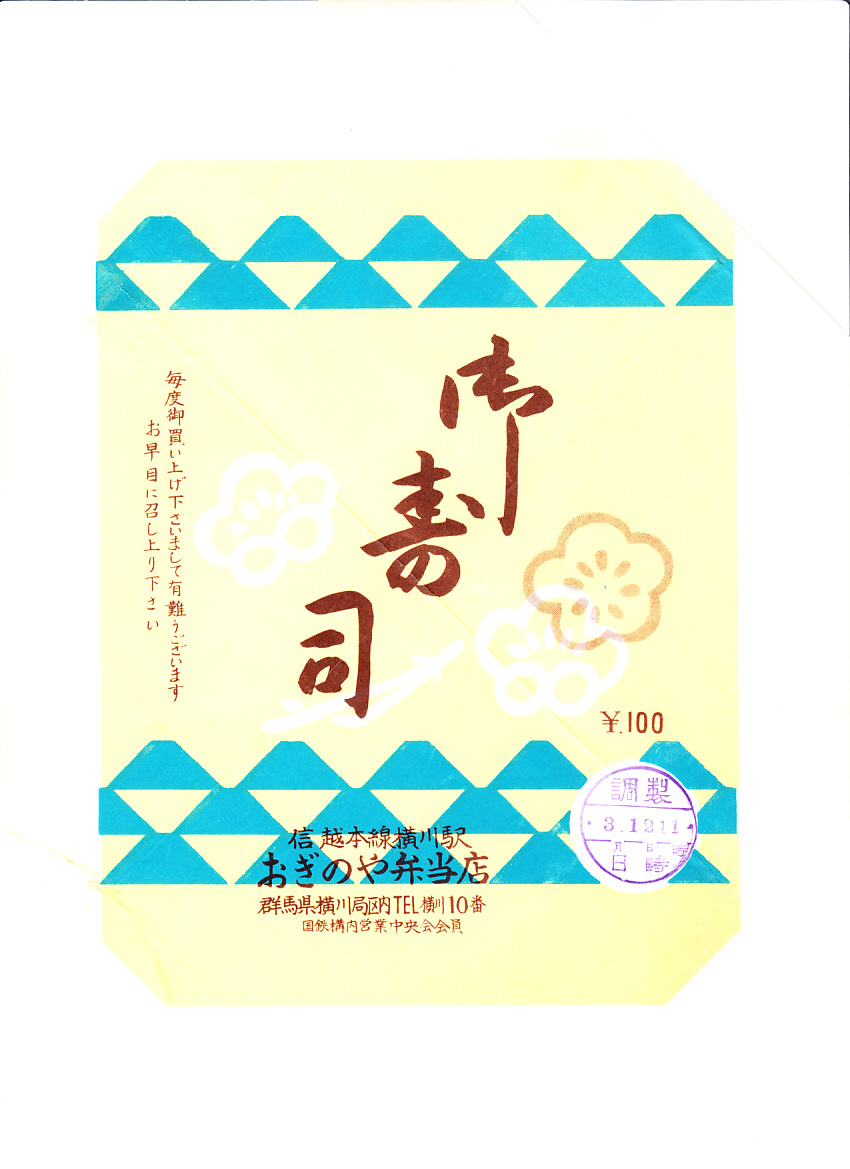 1963(昭和38)年3月12日11時の調製と思われる、昔の横川駅弁の掛紙。この絵柄は2000年代まで変わらなかった。